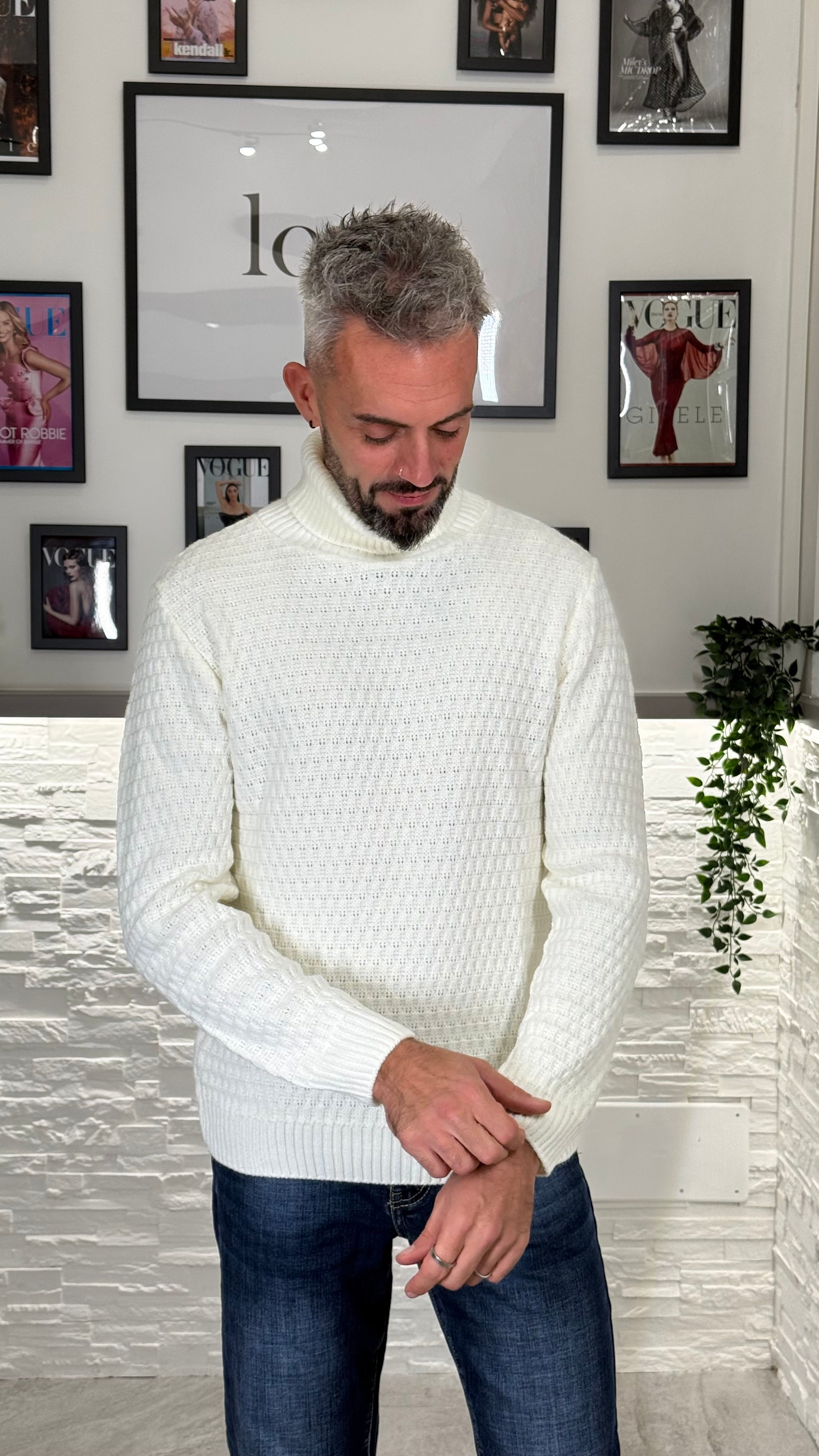 Maglione collo a costine alto, con lavorazione punto tondo.