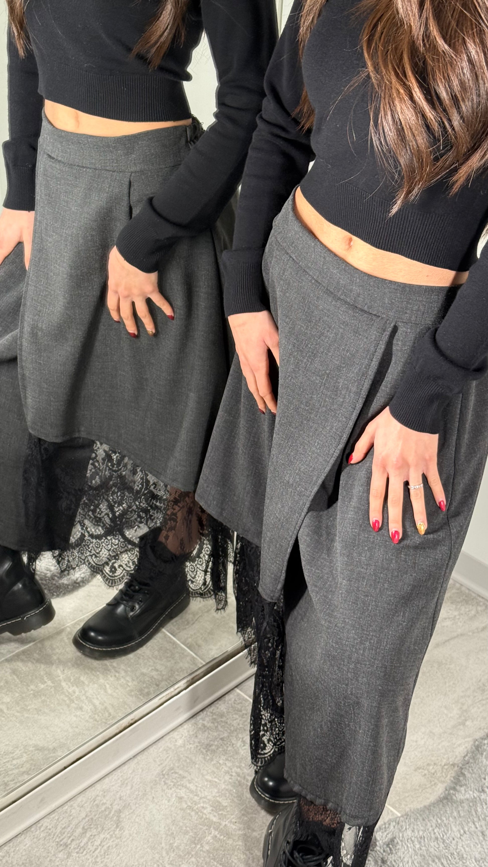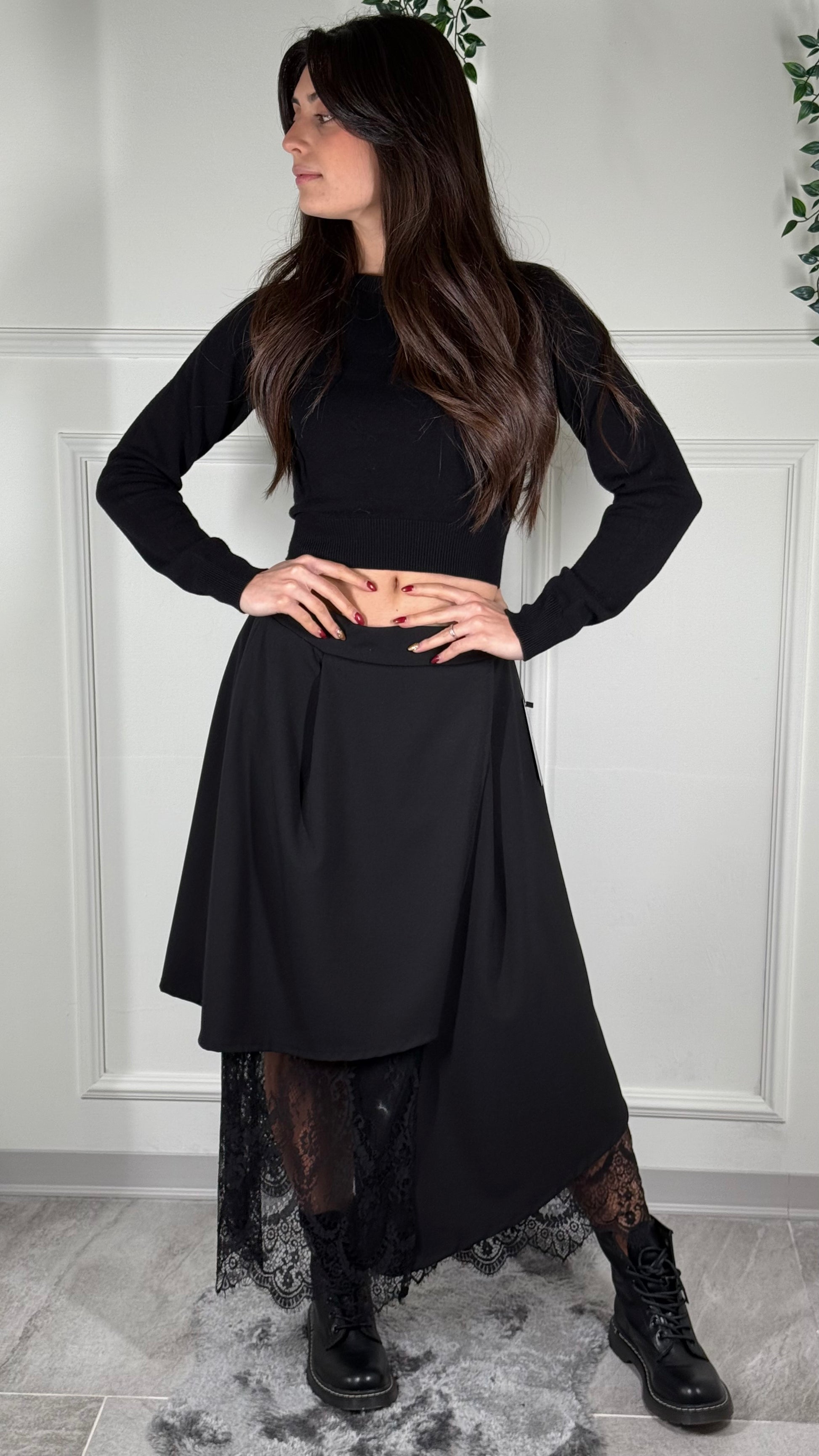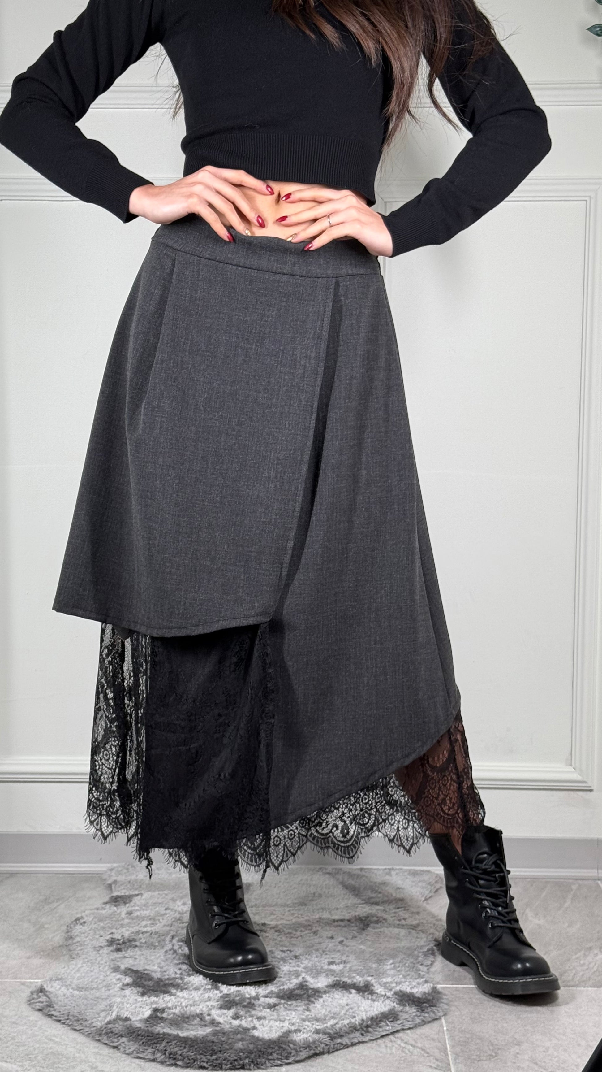 Gonna asimmetrica con elastico posteriore per una vestibilità confortevole. Design elegante arricchito da un raffinato inserto in pizzo sul bordo finale, ideale per un look sofisticato e moderno. vestibilità fino a 46