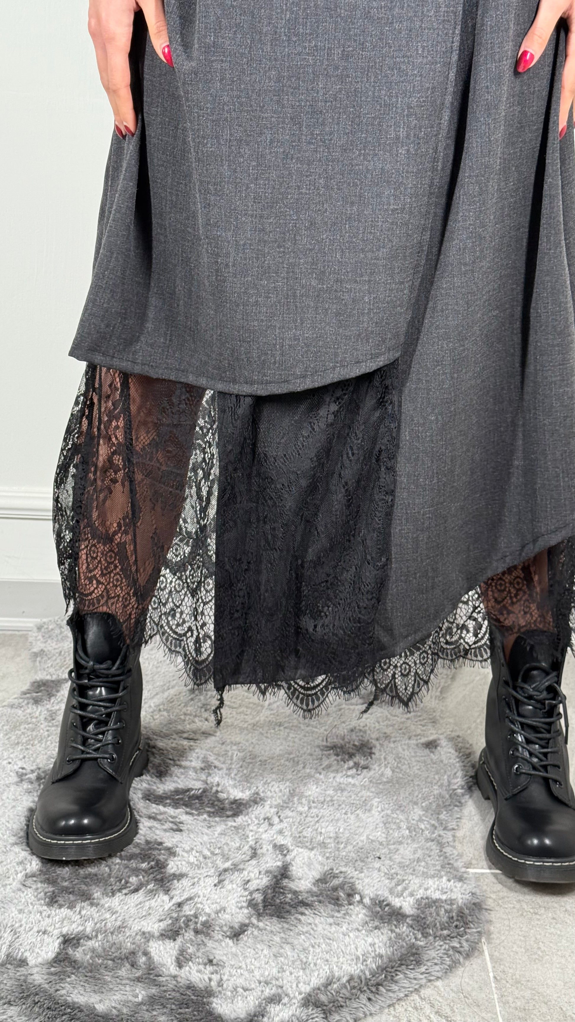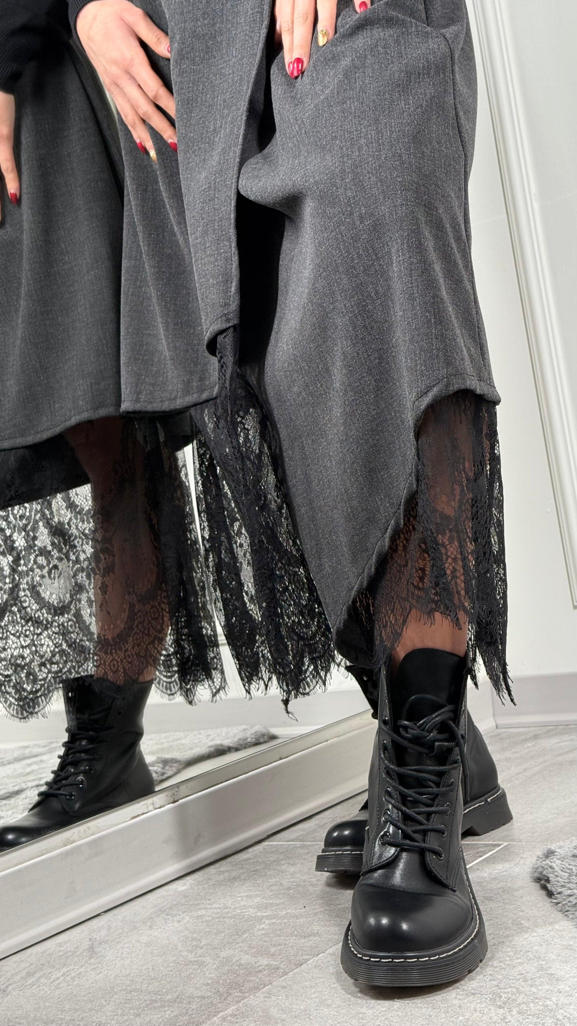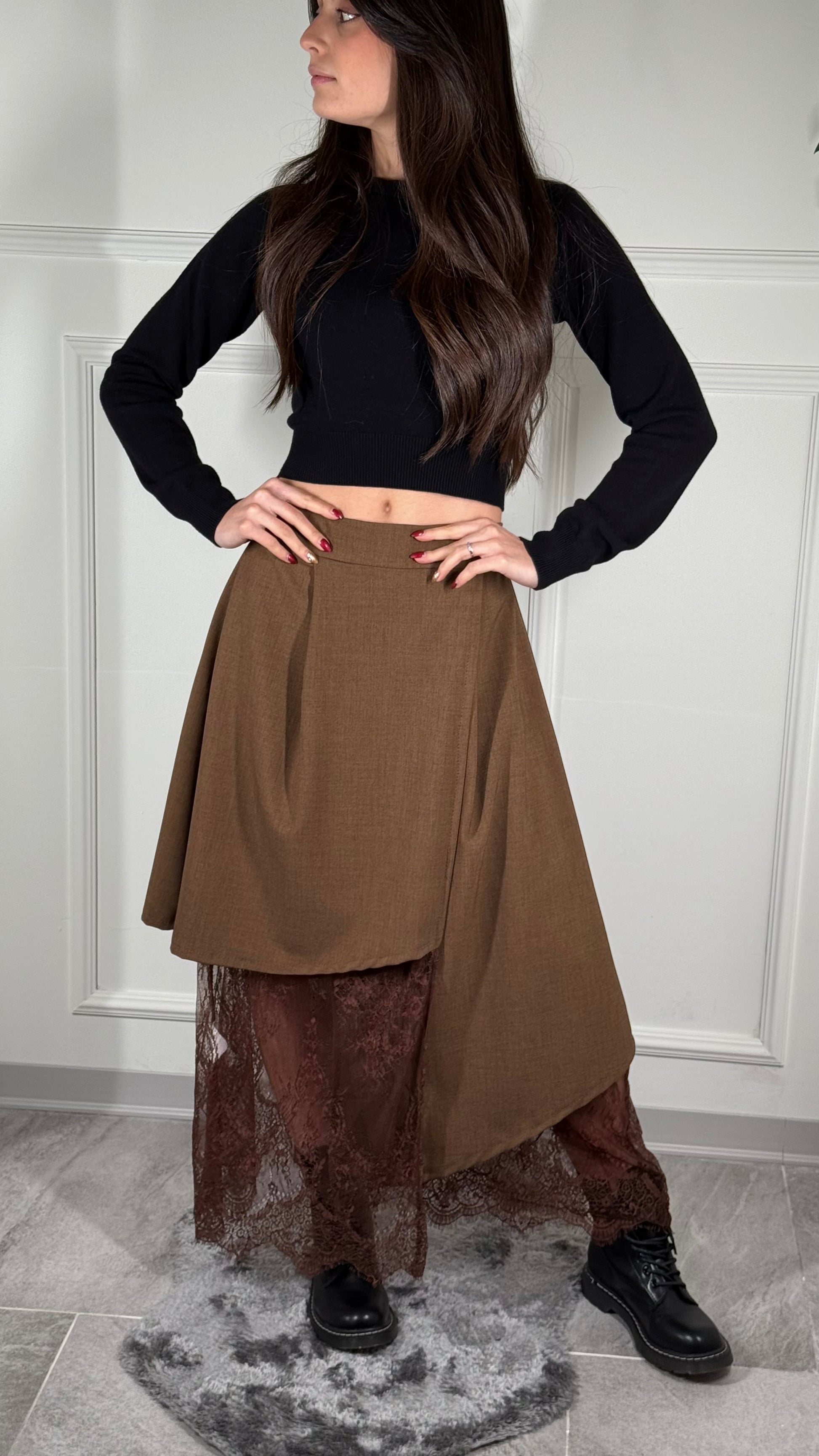Gonna asimmetrica con elastico posteriore per una vestibilità confortevole. Design elegante arricchito da un raffinato inserto in pizzo sul bordo finale, ideale per un look sofisticato e moderno. vestibilità fino a 46