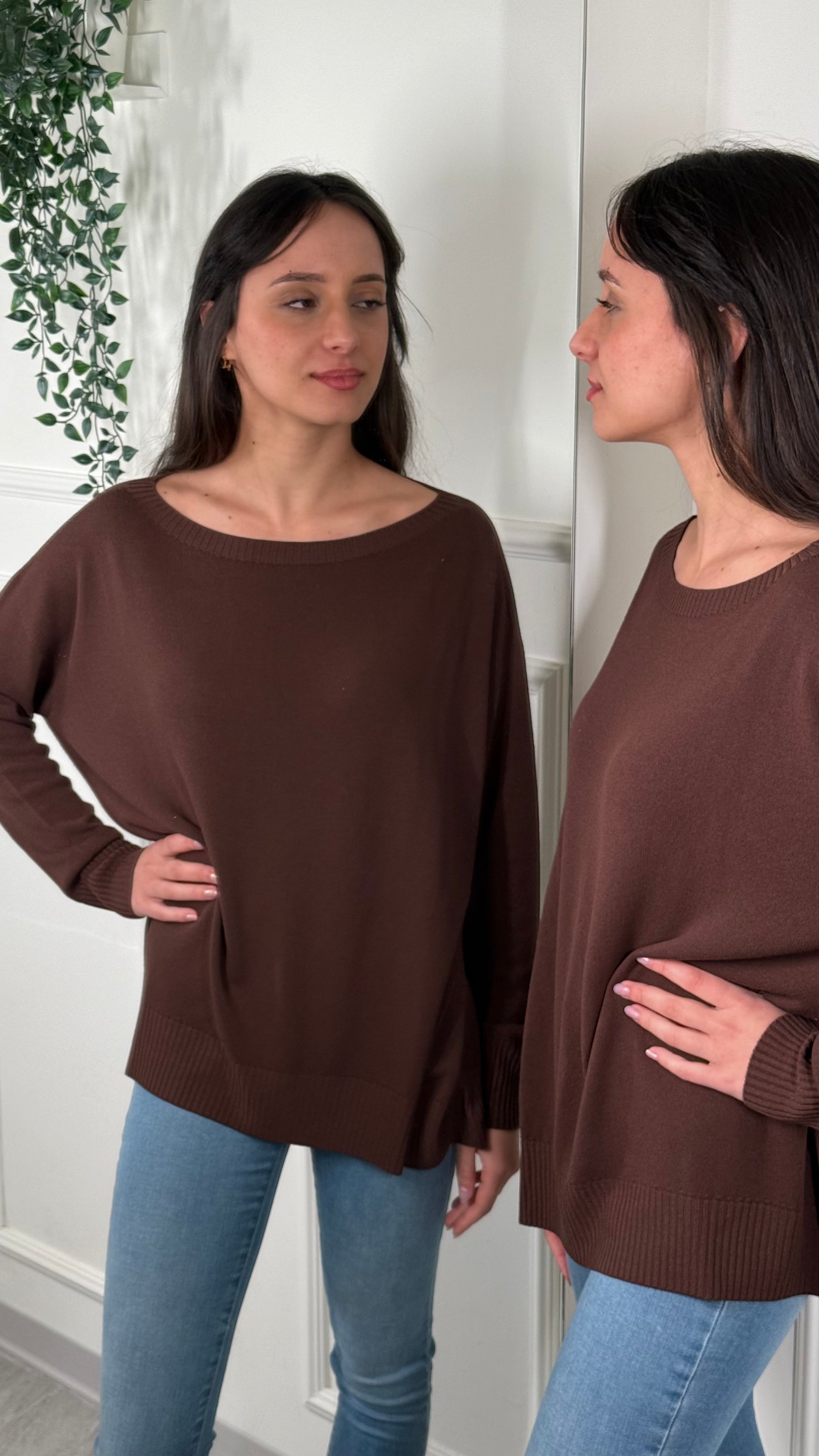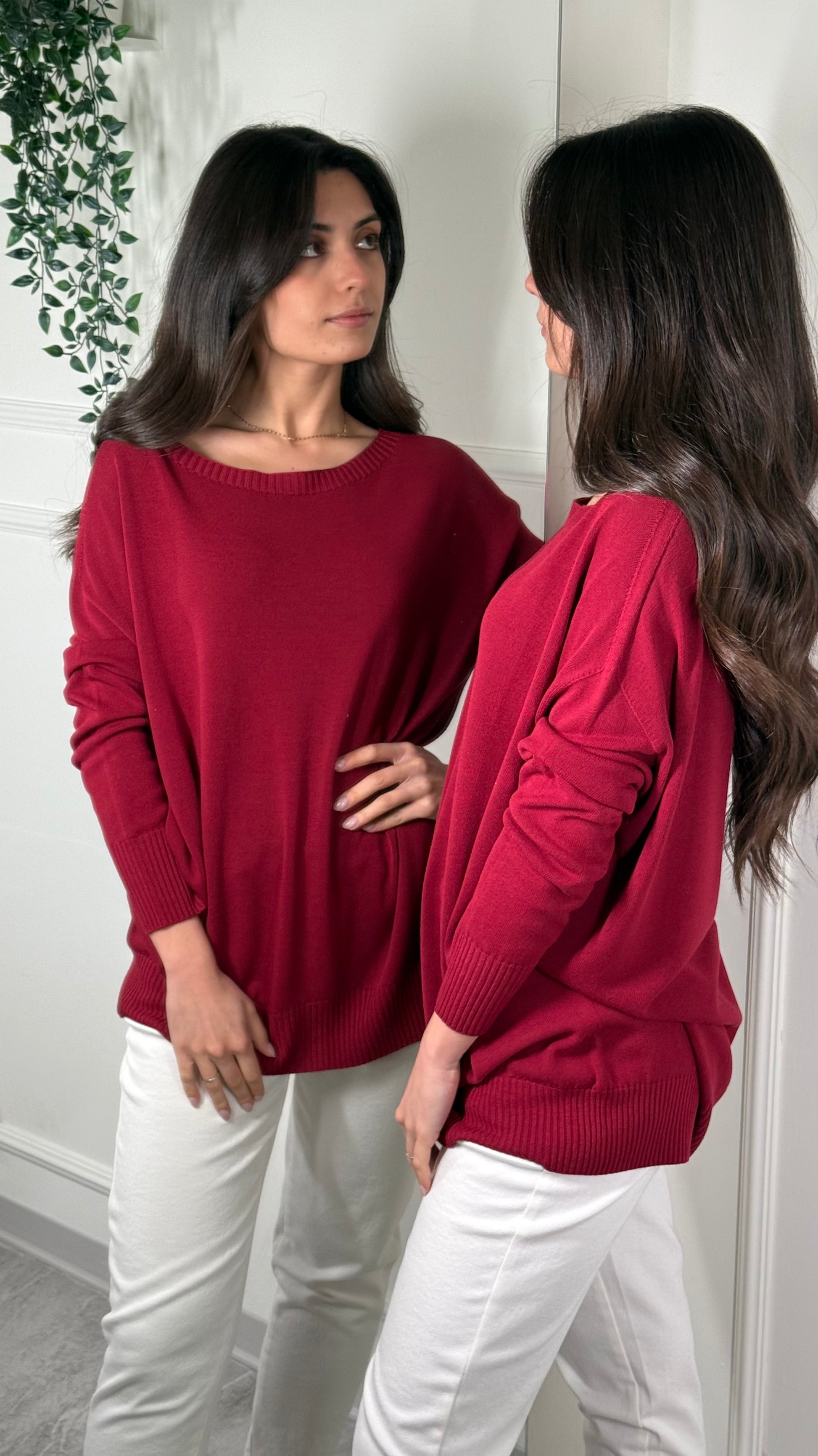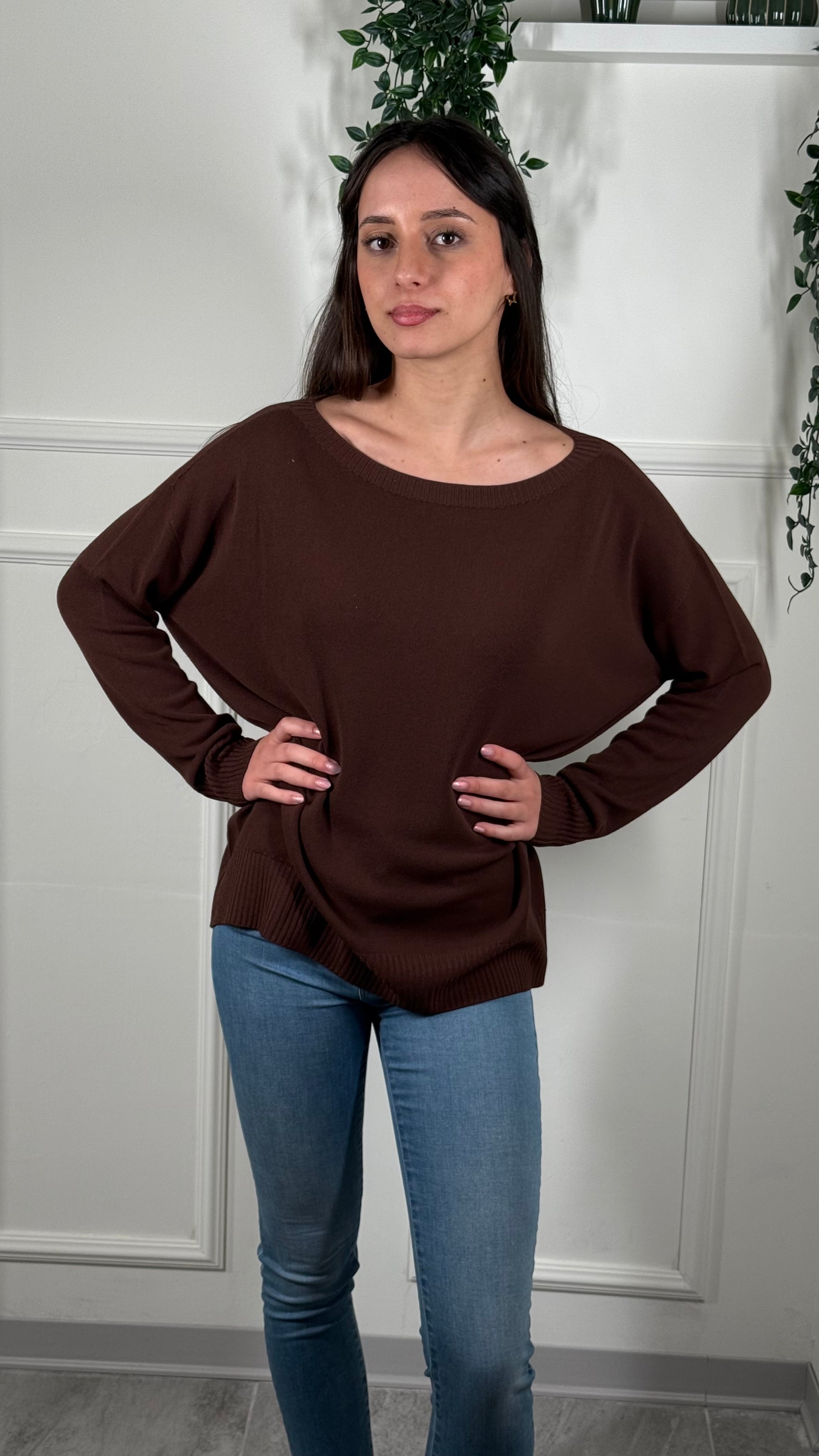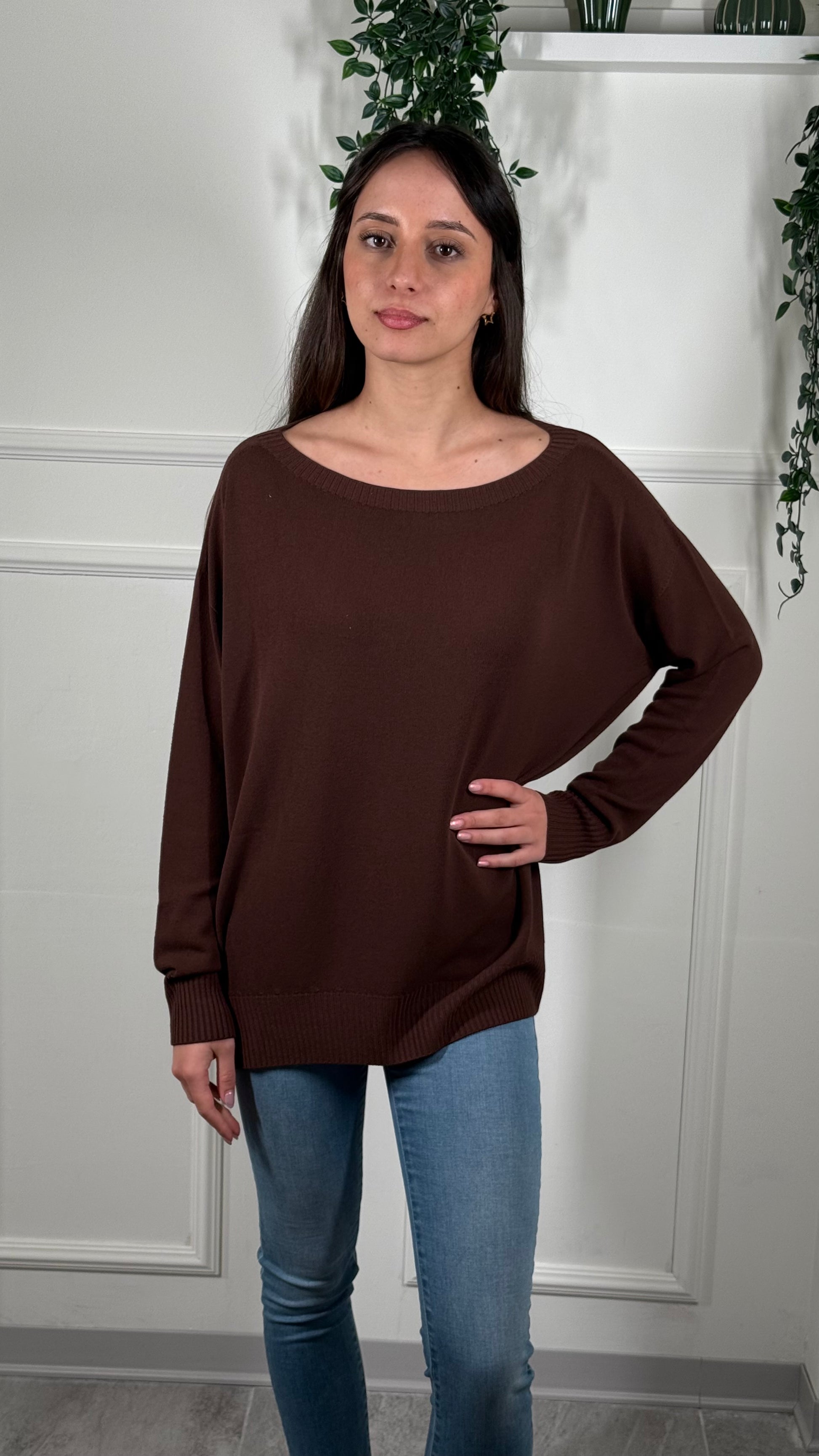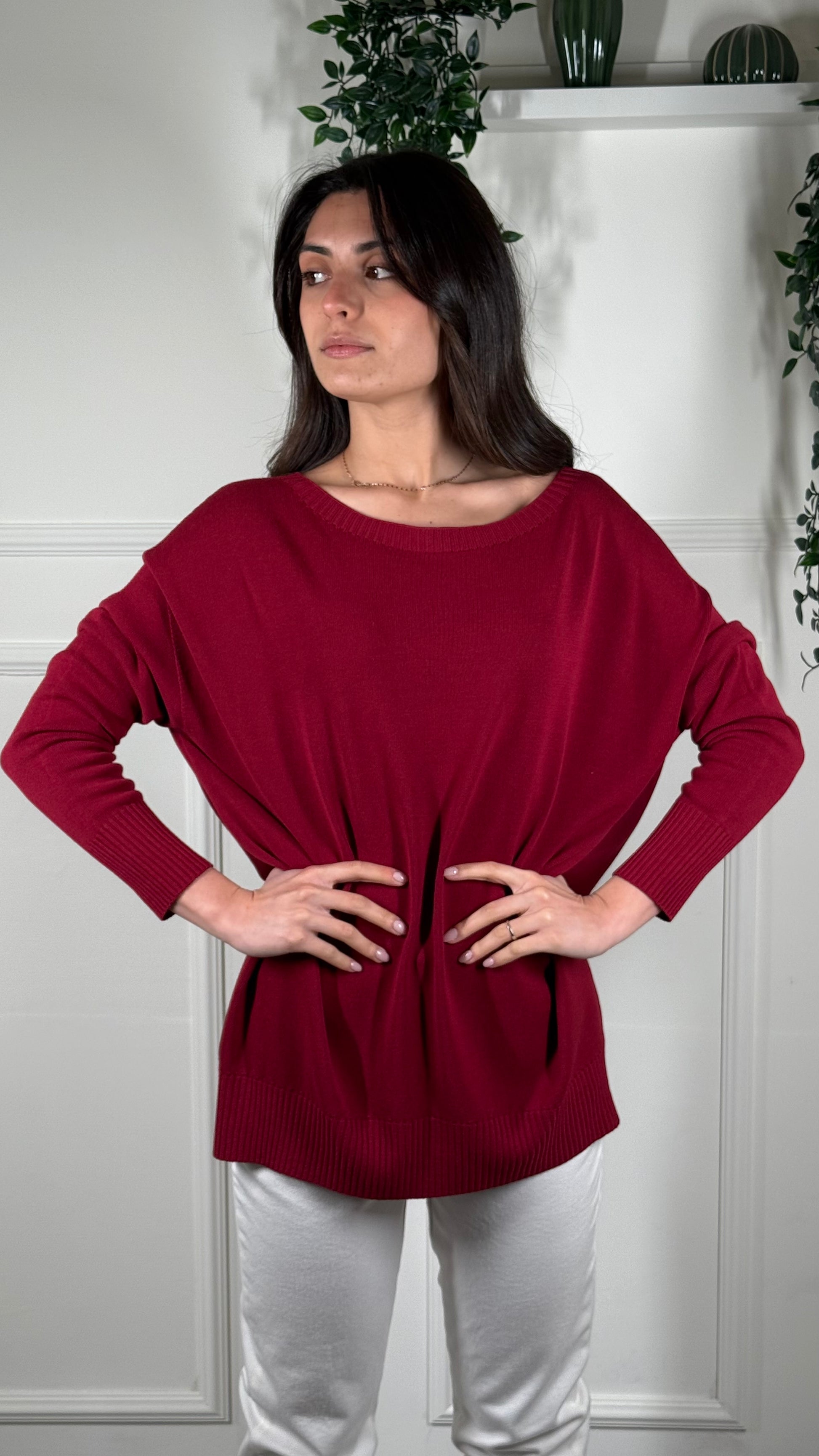 Maglia Over, manica a pipistrello, scollo a Barca.