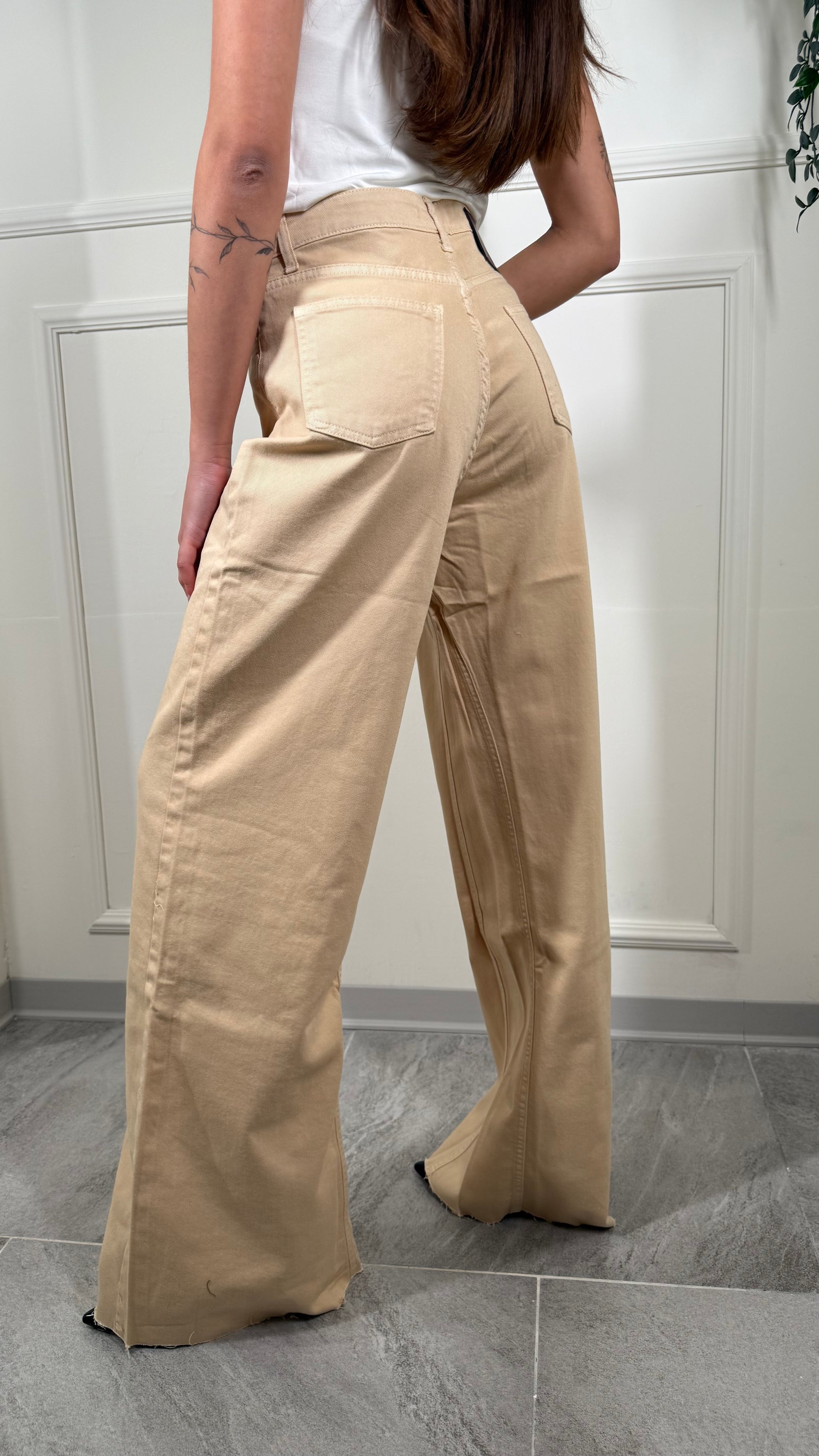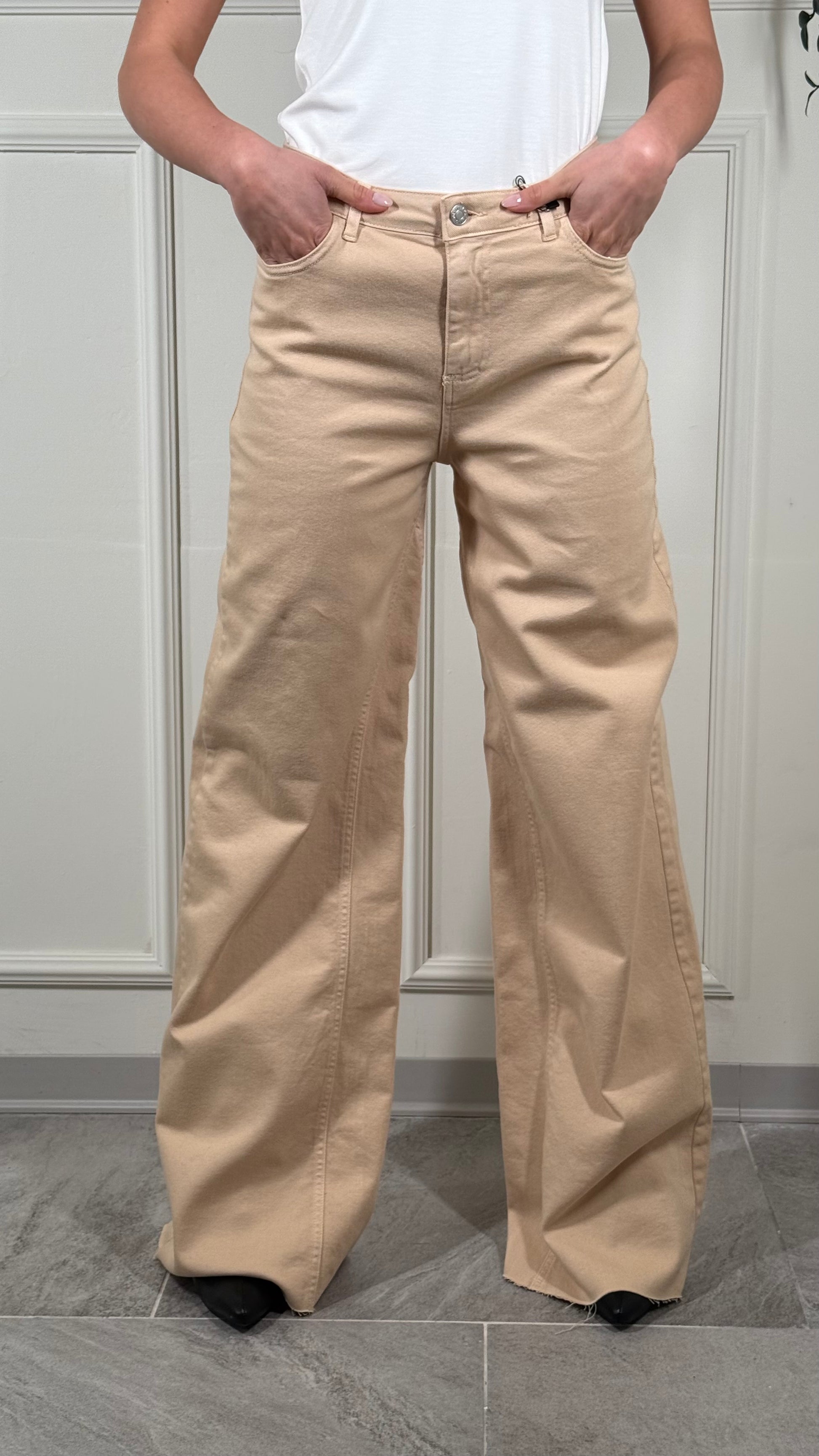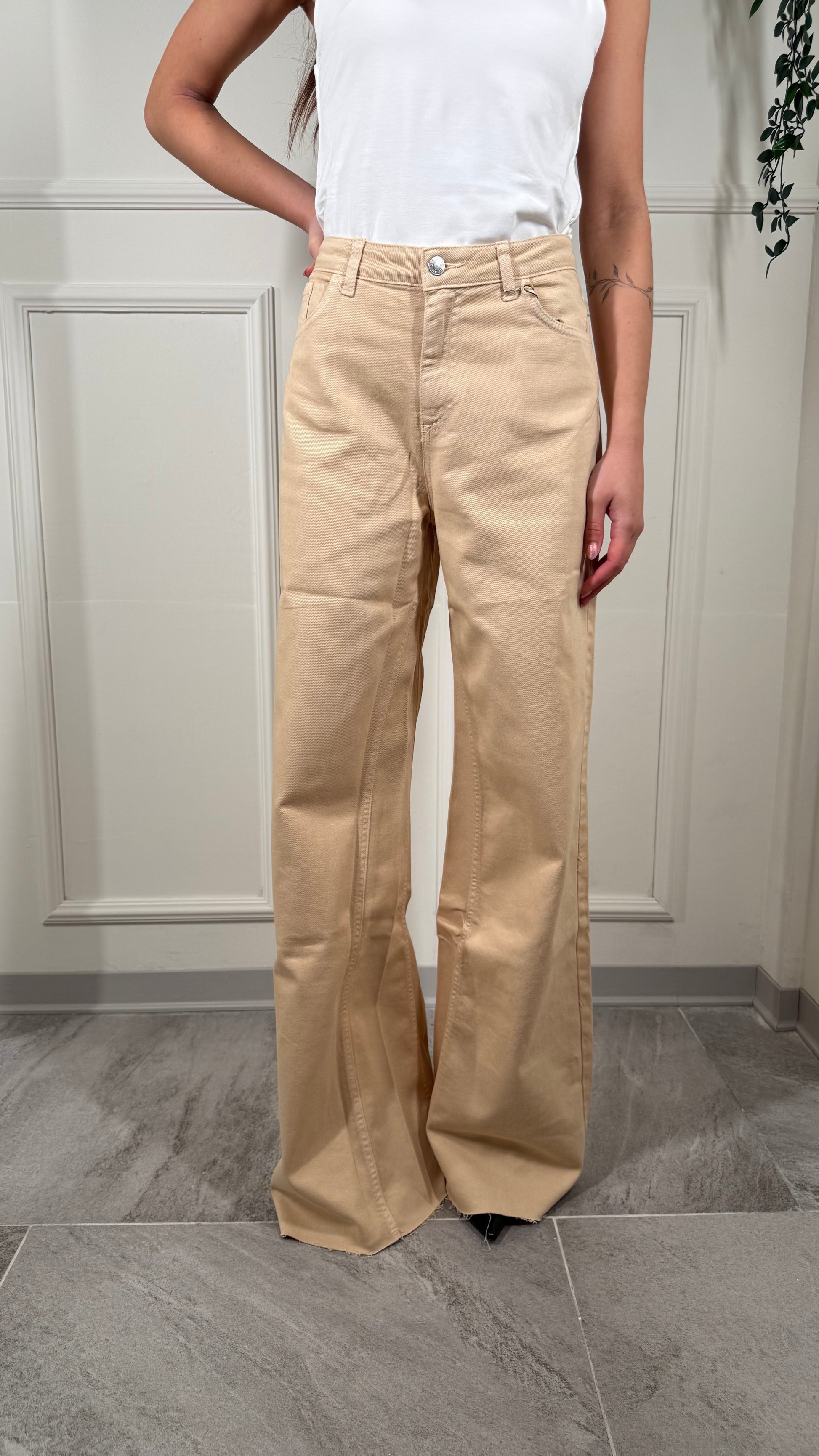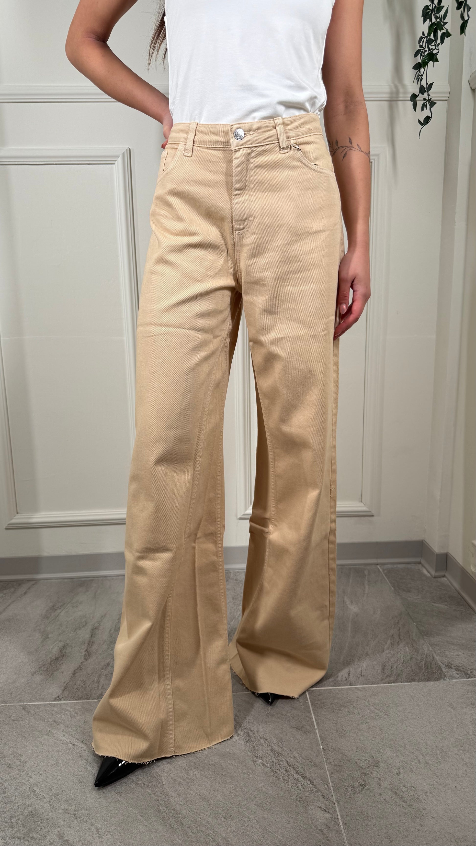 Pantalone, tessuto jeans, palazzo, largo, in fondo, taglio vivo con Fran Gine, vestibilità regolare