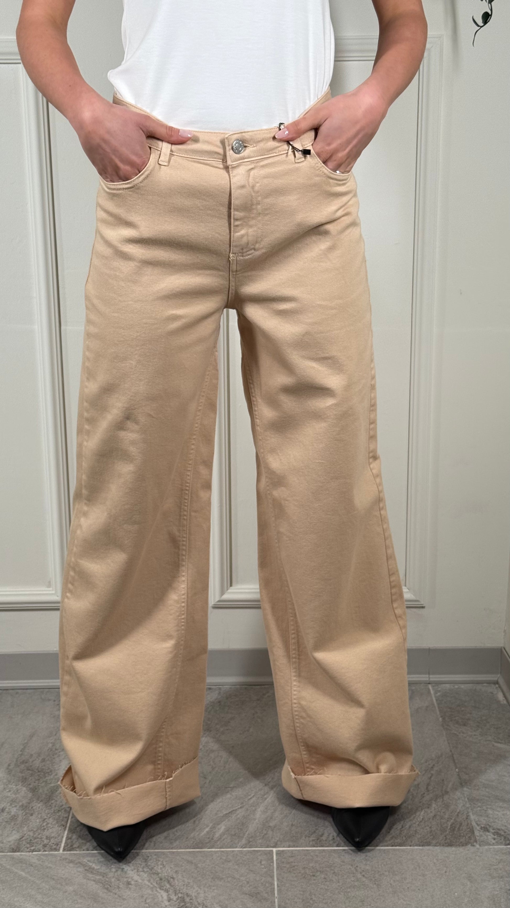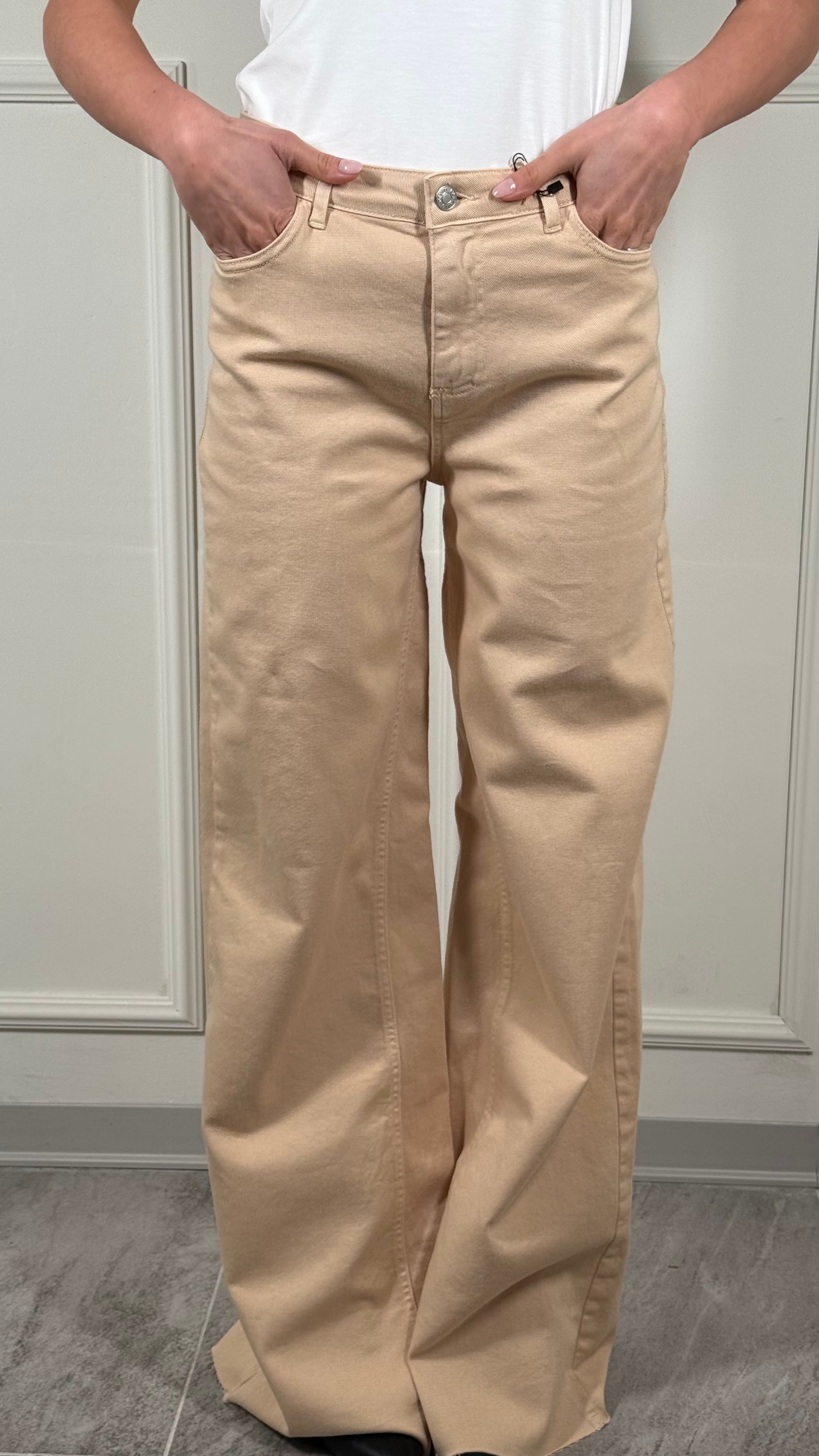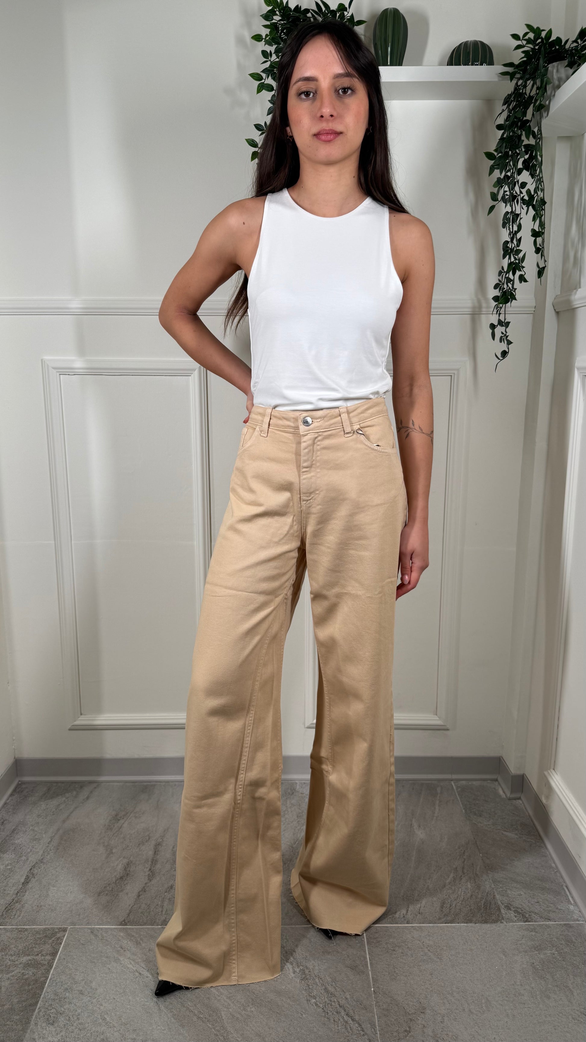 Pantalone, tessuto jeans, palazzo, largo, in fondo, taglio vivo con Fran Gine, vestibilità regolare