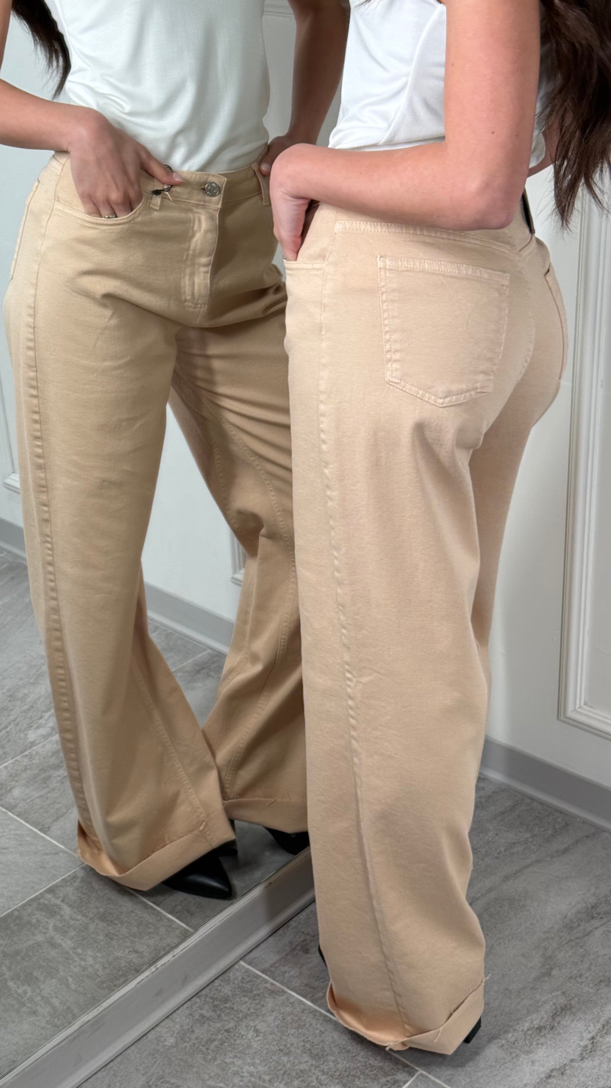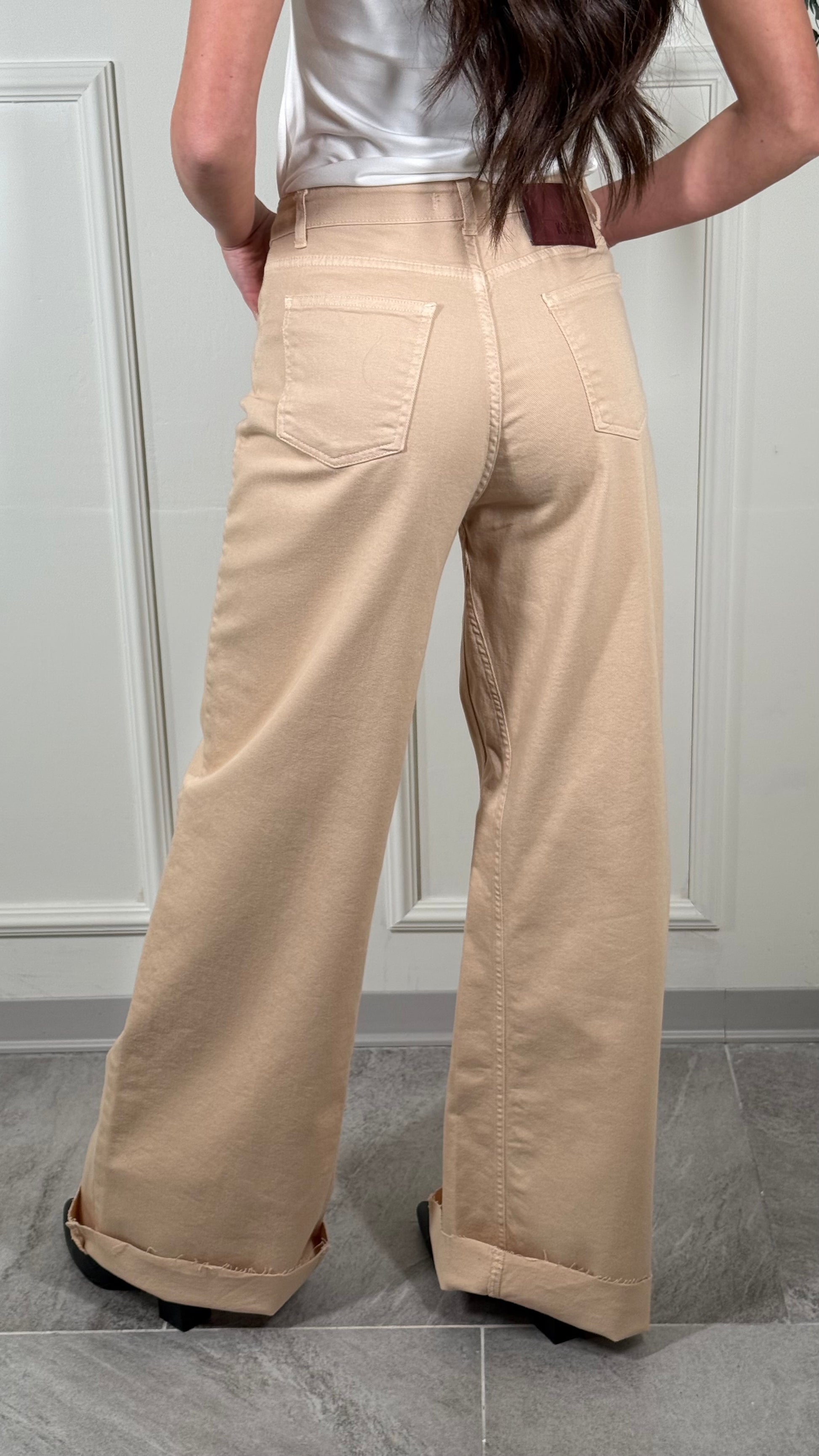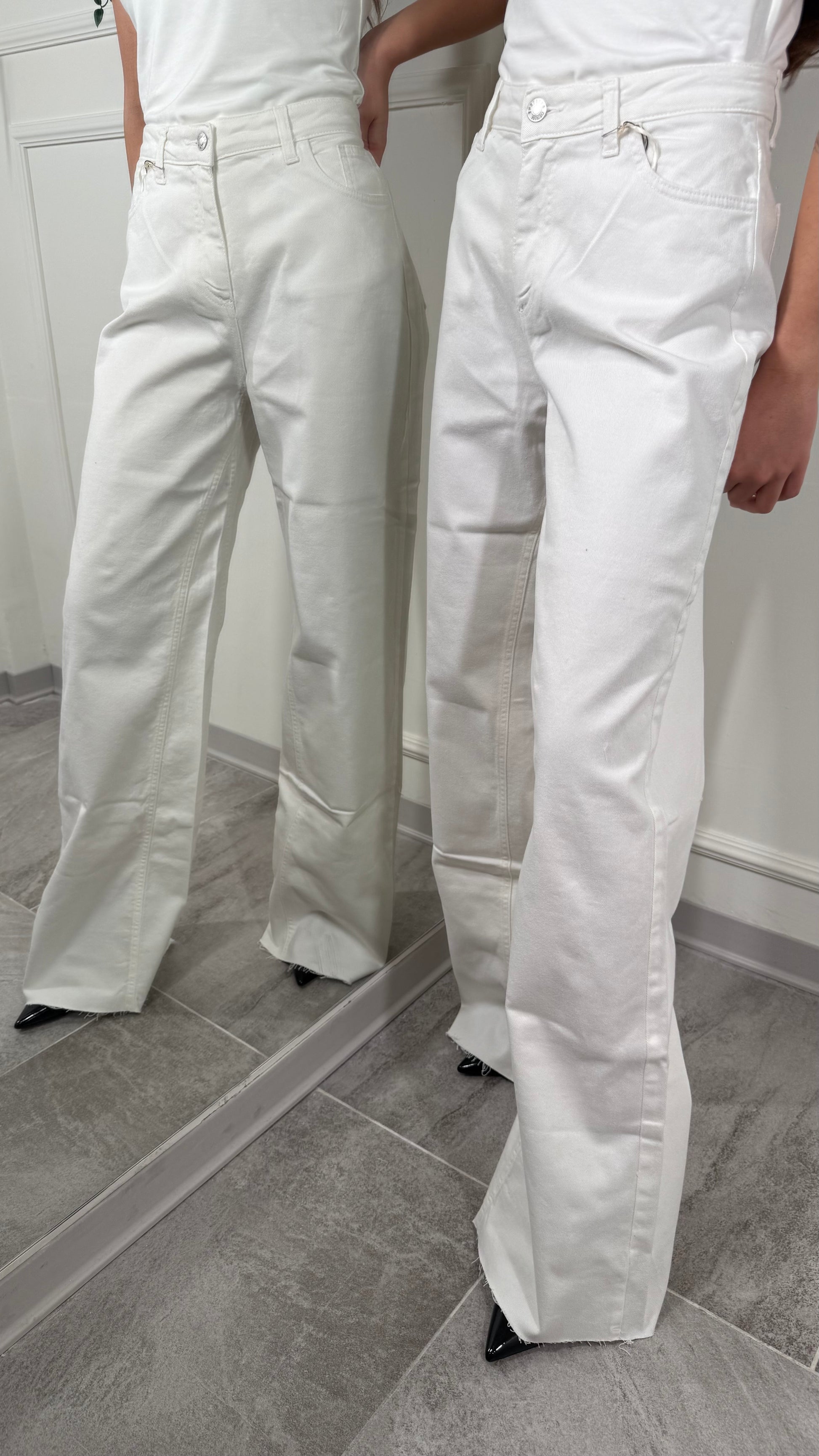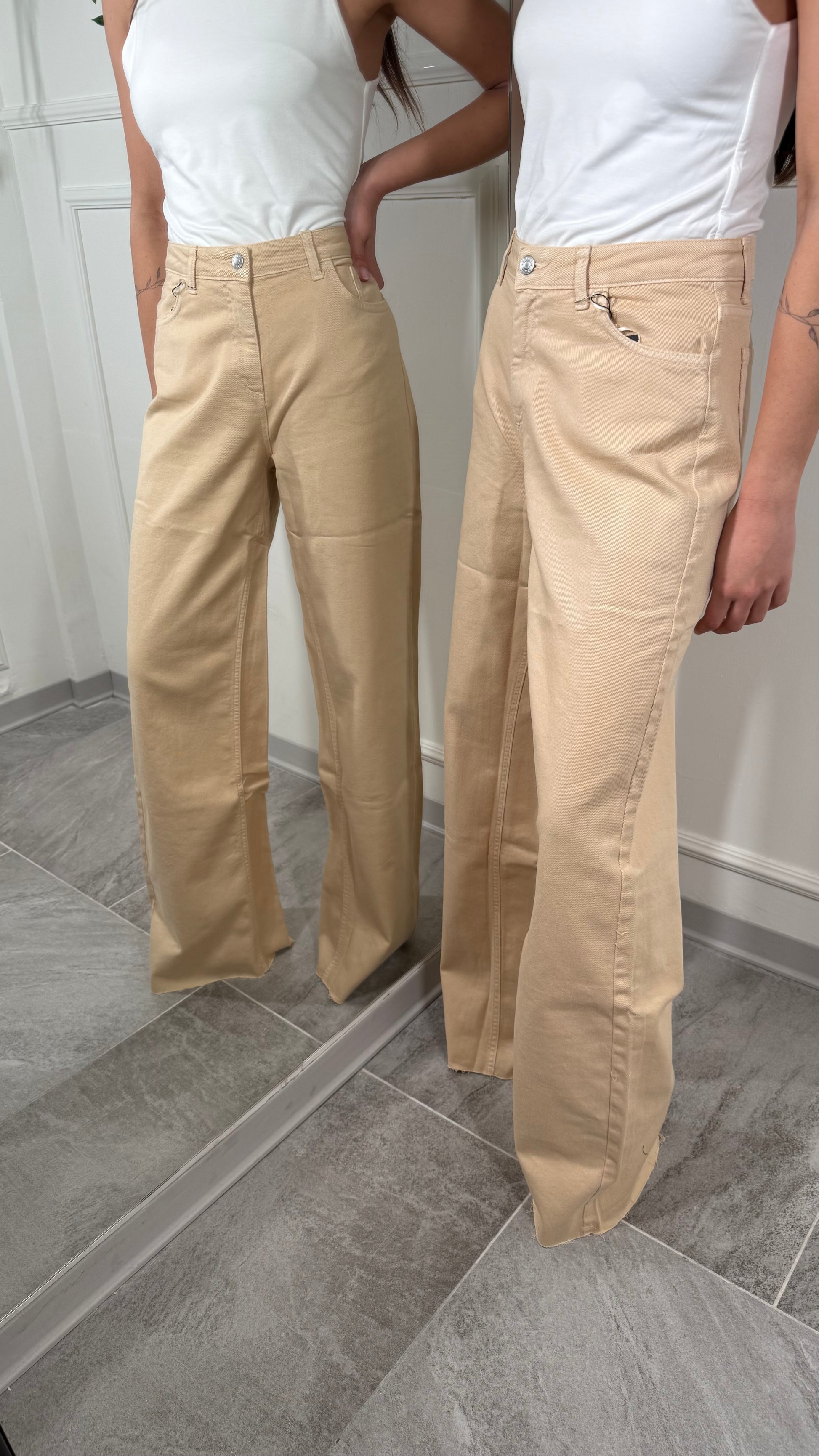 Pantalone, tessuto jeans, palazzo, largo, in fondo, taglio vivo con Fran Gine, vestibilità regolare