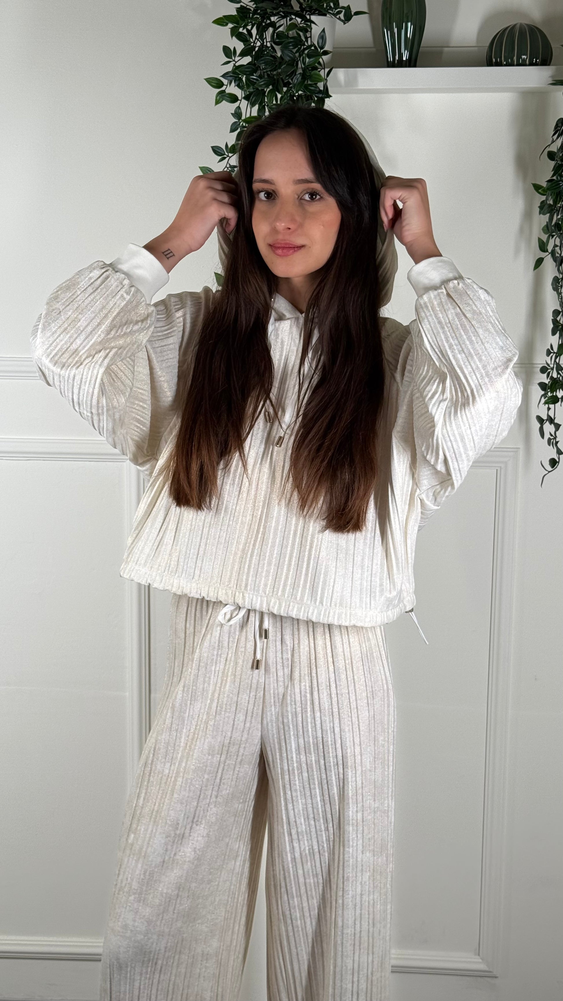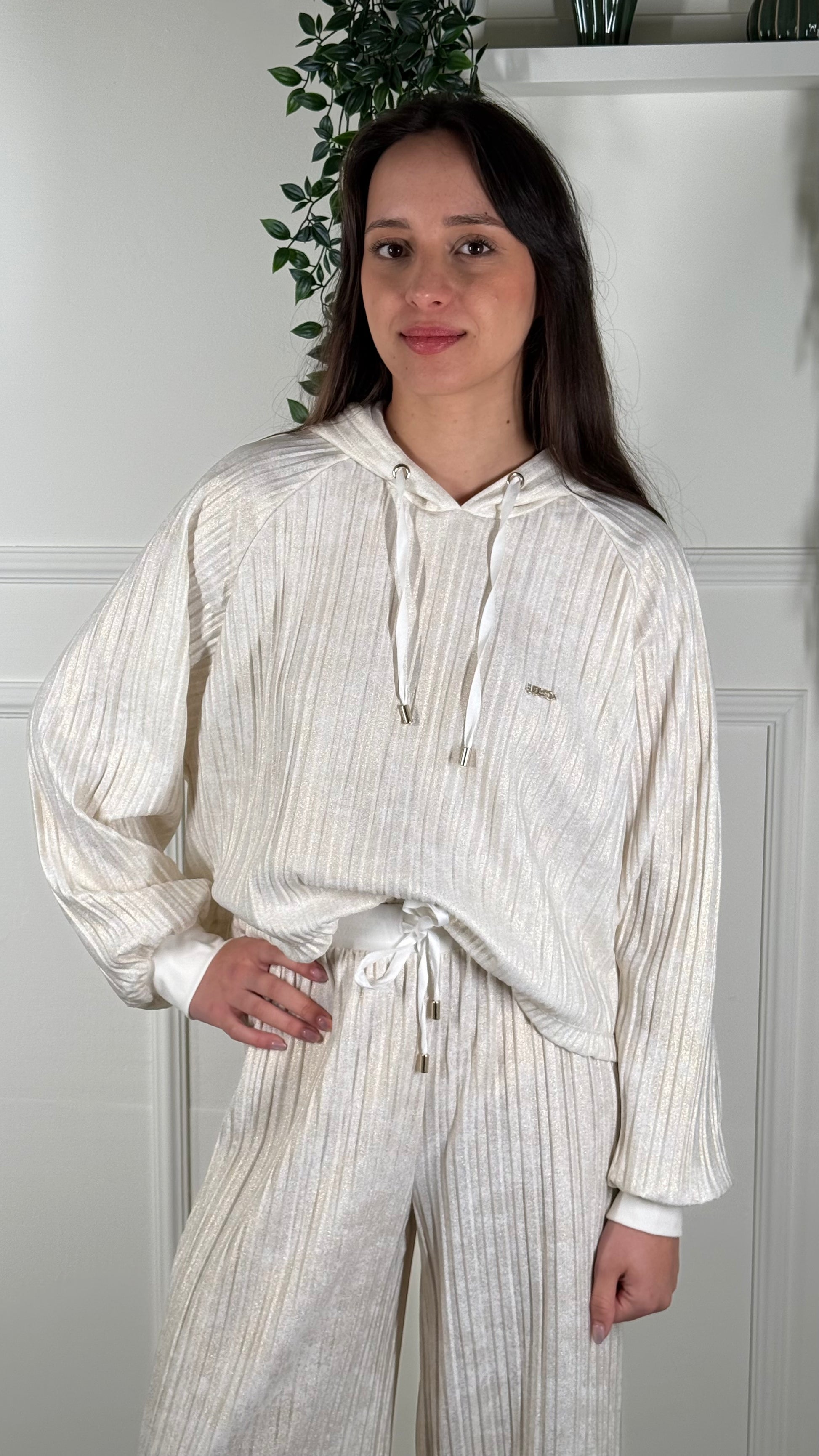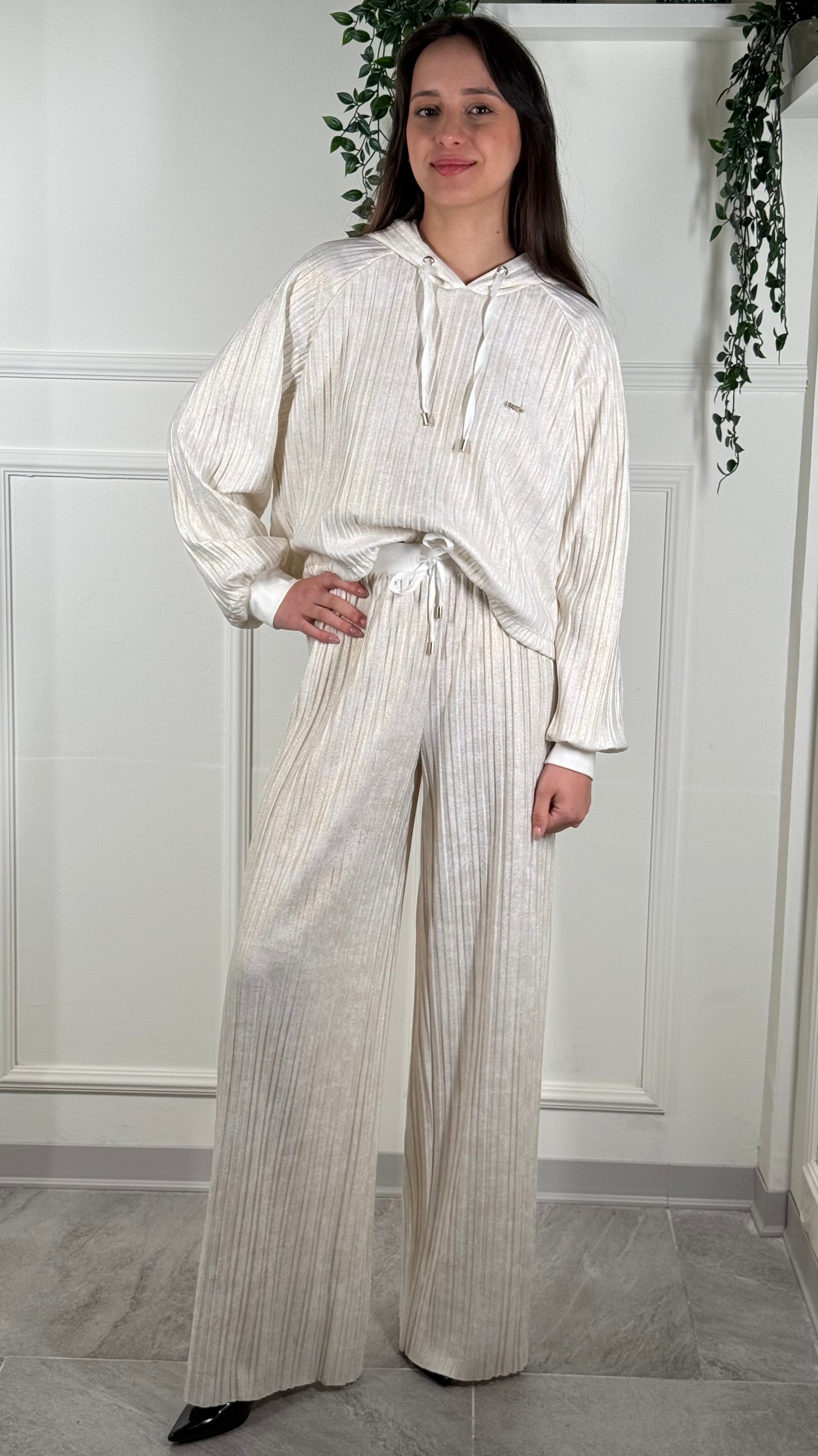 Completo in tuta con leggera costi color bianco slavato di avorio presente brillantini sul lavaggio taglia 42 veste anche una 44