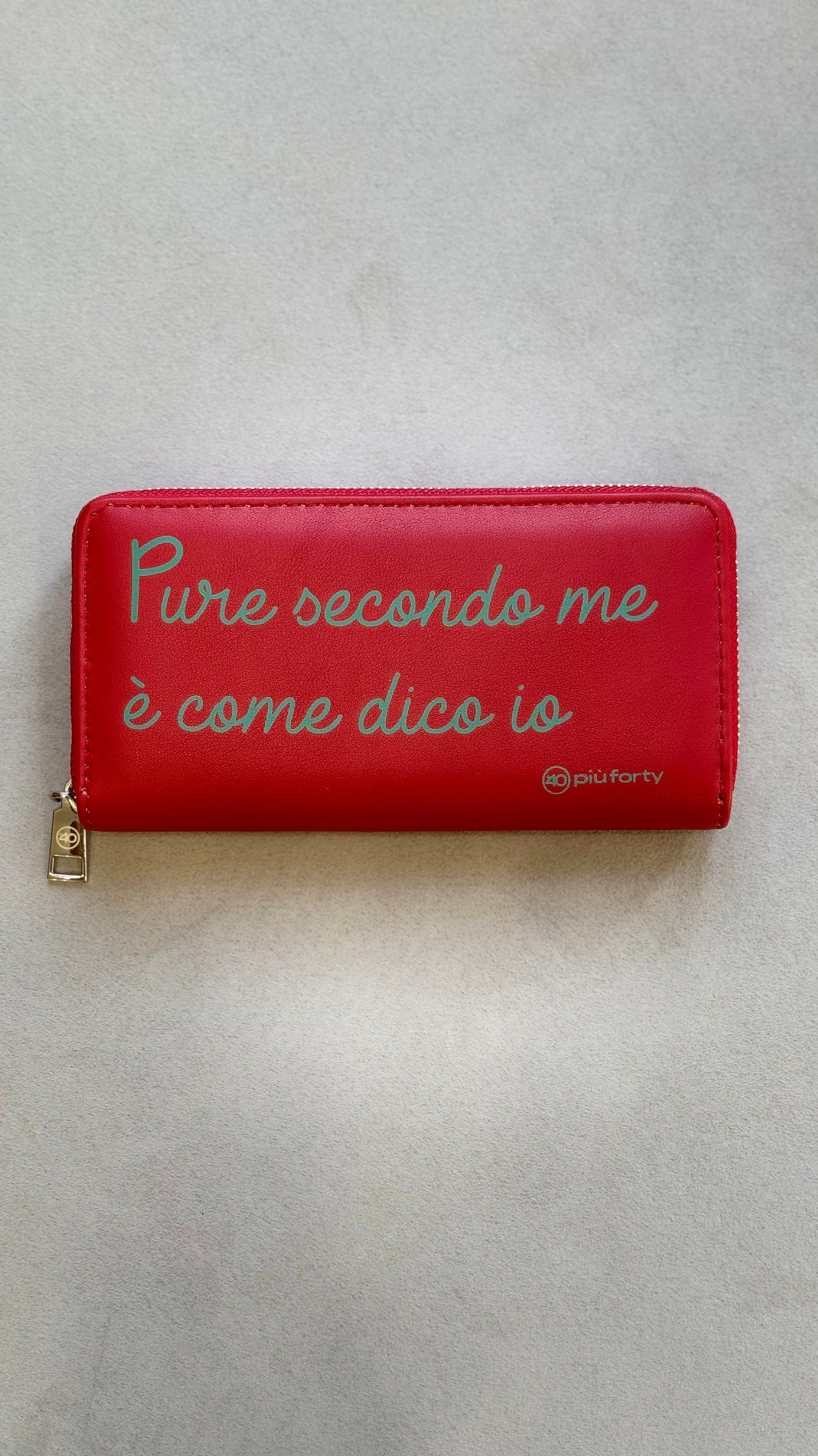 Portafoglio Ecopelle Rosso con scritta celeste, misure 19cmx10cm, 8 scompartimenti tessera, 2 divisori centrali + porta monete e tasche laterali