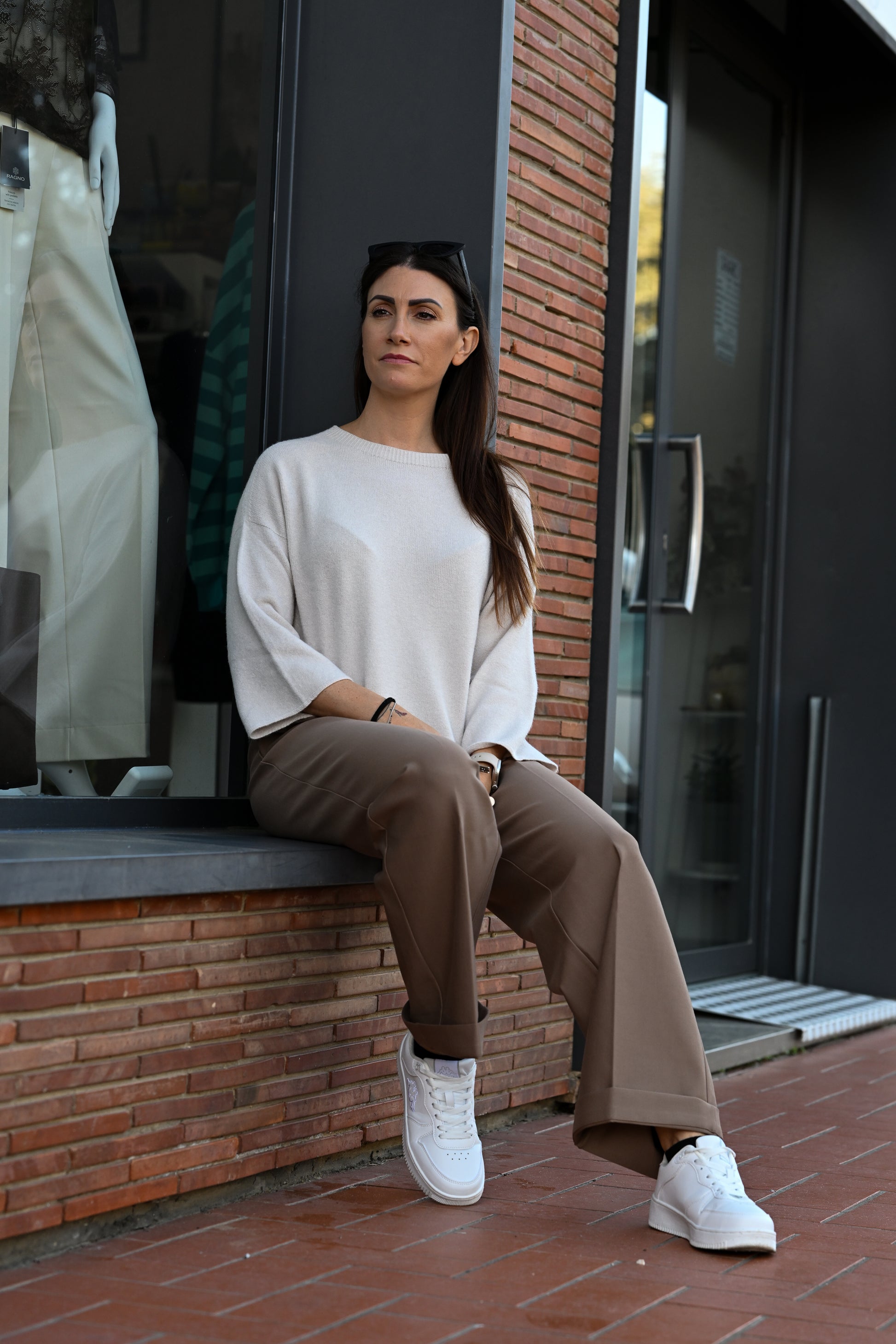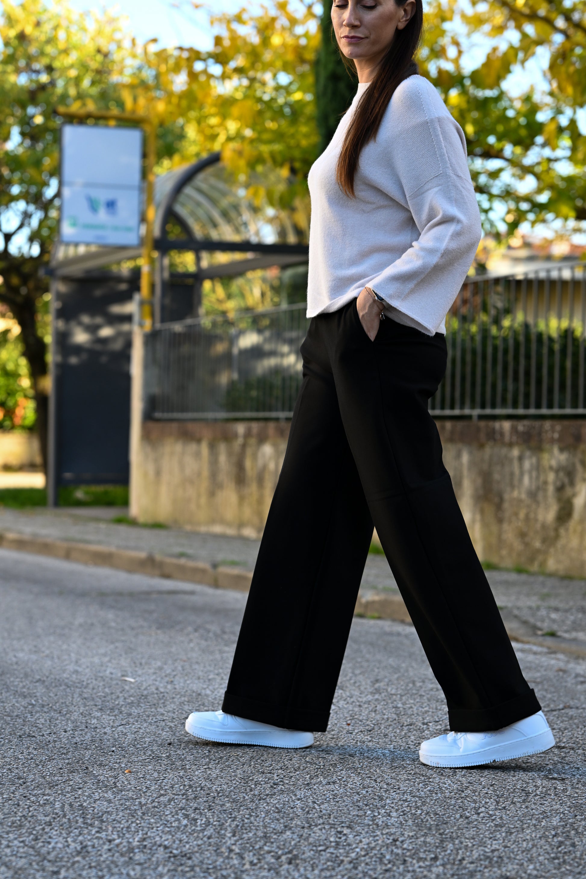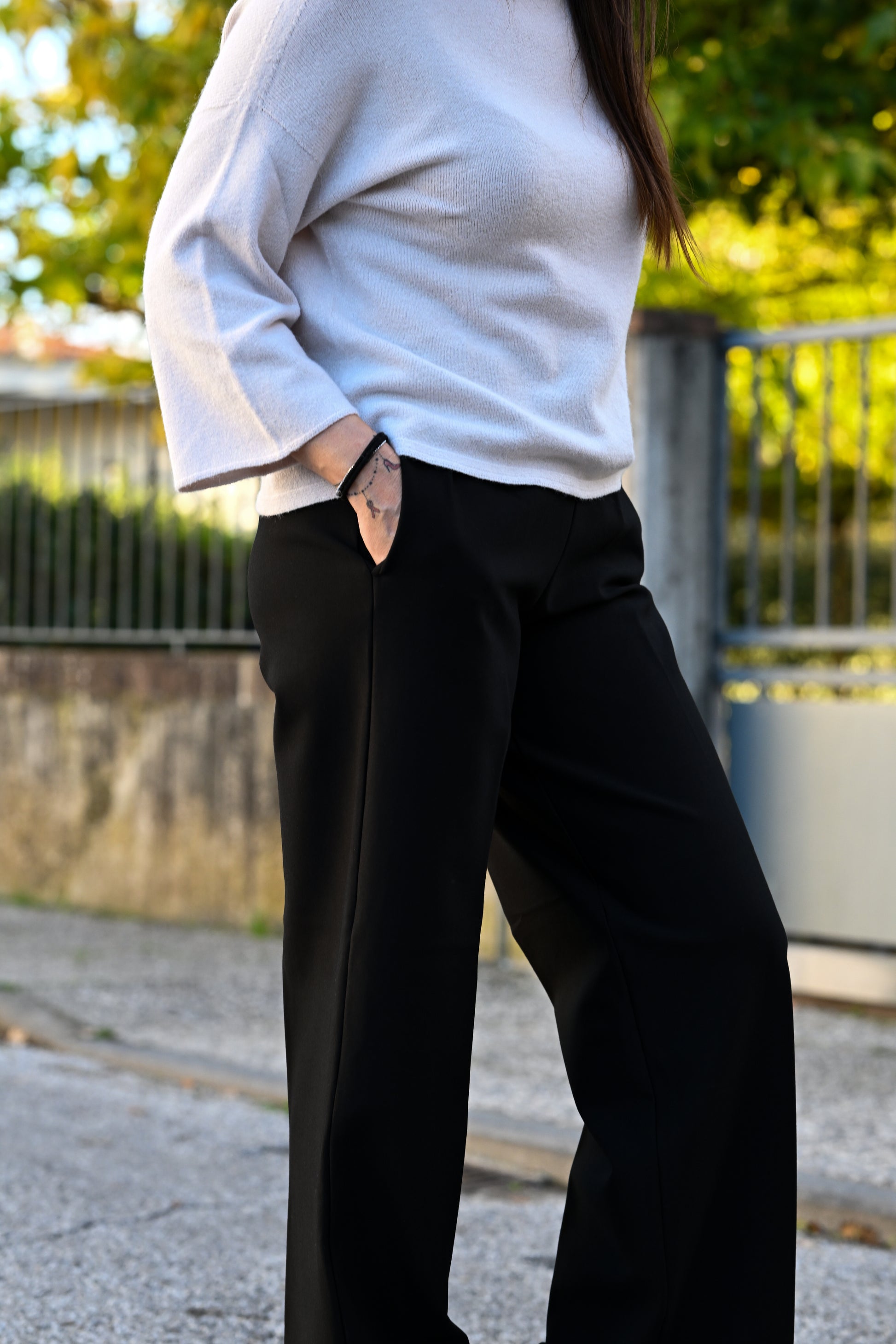 Questo modello è costruito con vita elasticizzata senza passanti, ma con delicate pinces sia sul davanti che sul retro per una maggiore eleganza. Con pratiche tasche laterali è comodo come indossare un leggings pur mantenendo l'eleganza di un pantalone.