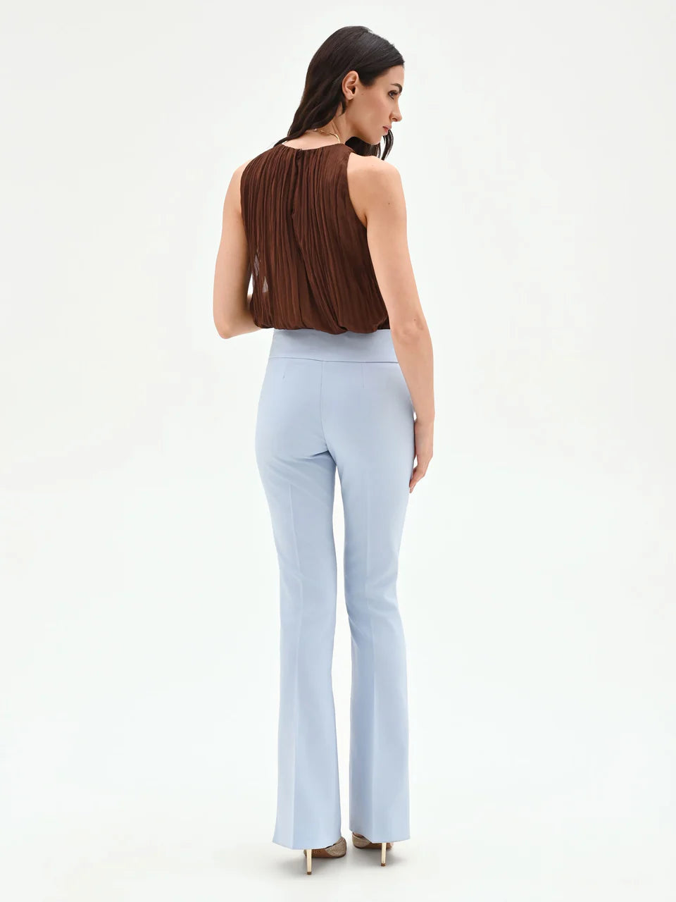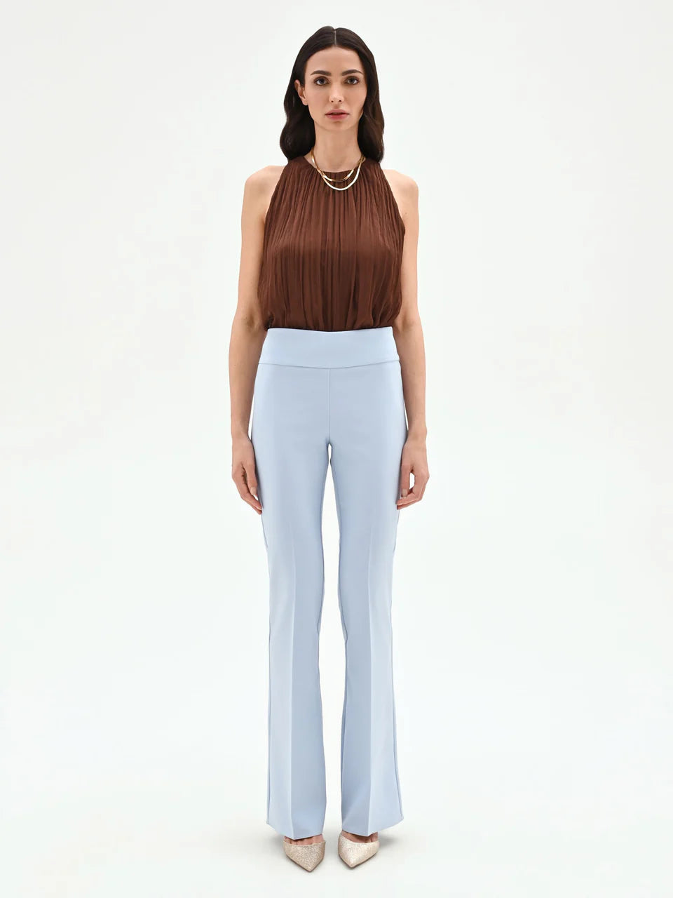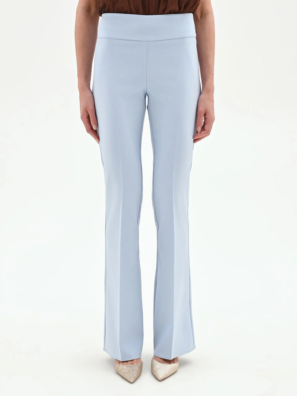 Pantaloni eleganti color azzurro polvere dal taglio slim leggermente svasato sul fondo. Caratterizzati da vita alta con fascia liscia e linea pulita che slancia la figura, sono perfetti per un look raffinato e contemporaneo.