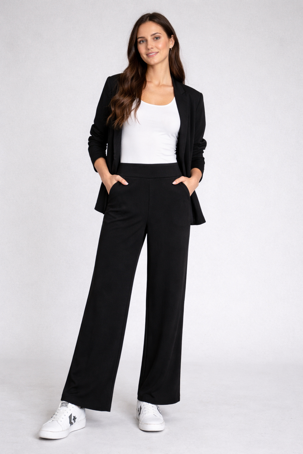 Eleva il tuo stile quotidiano con questo pantalone a gamba larga, sintesi perfetta tra eleganza fluida e comfort assoluto. Il design è definito dalla caratteristica fascia elastica alta, studiata per valorizzare il punto vita offrendo un fit impeccabile senza costrizioni.