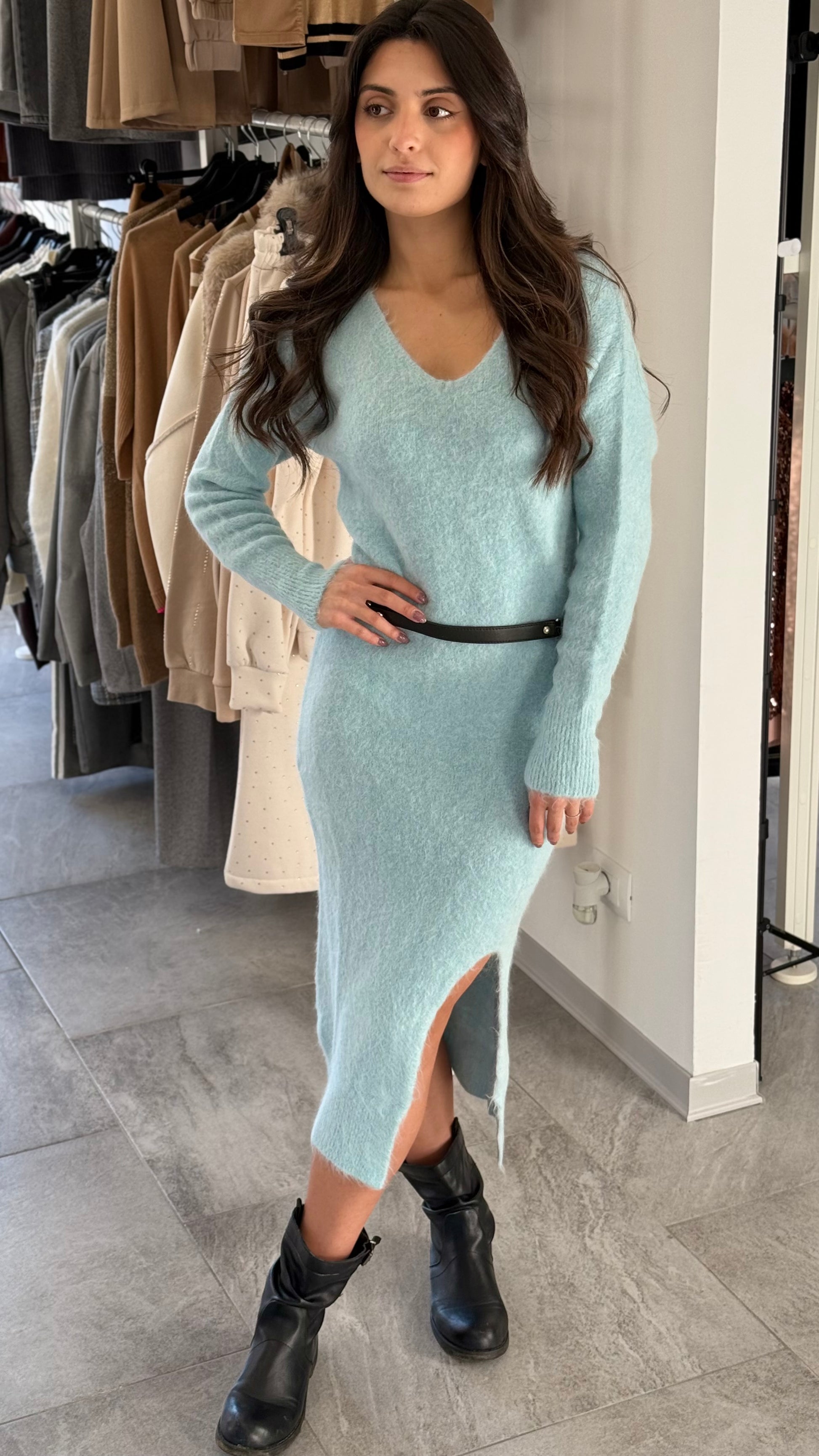Elegante e avvolgente, questo abito lungo con scollo a V è realizzato in una pregiata miscela di 52% alpaca e 13% lana, ideale per le giornate più fresche. Disponibile in delicate tonalità di rosa e celeste, unisce comfort e raffinatezza per un look sofisticato e femminile.