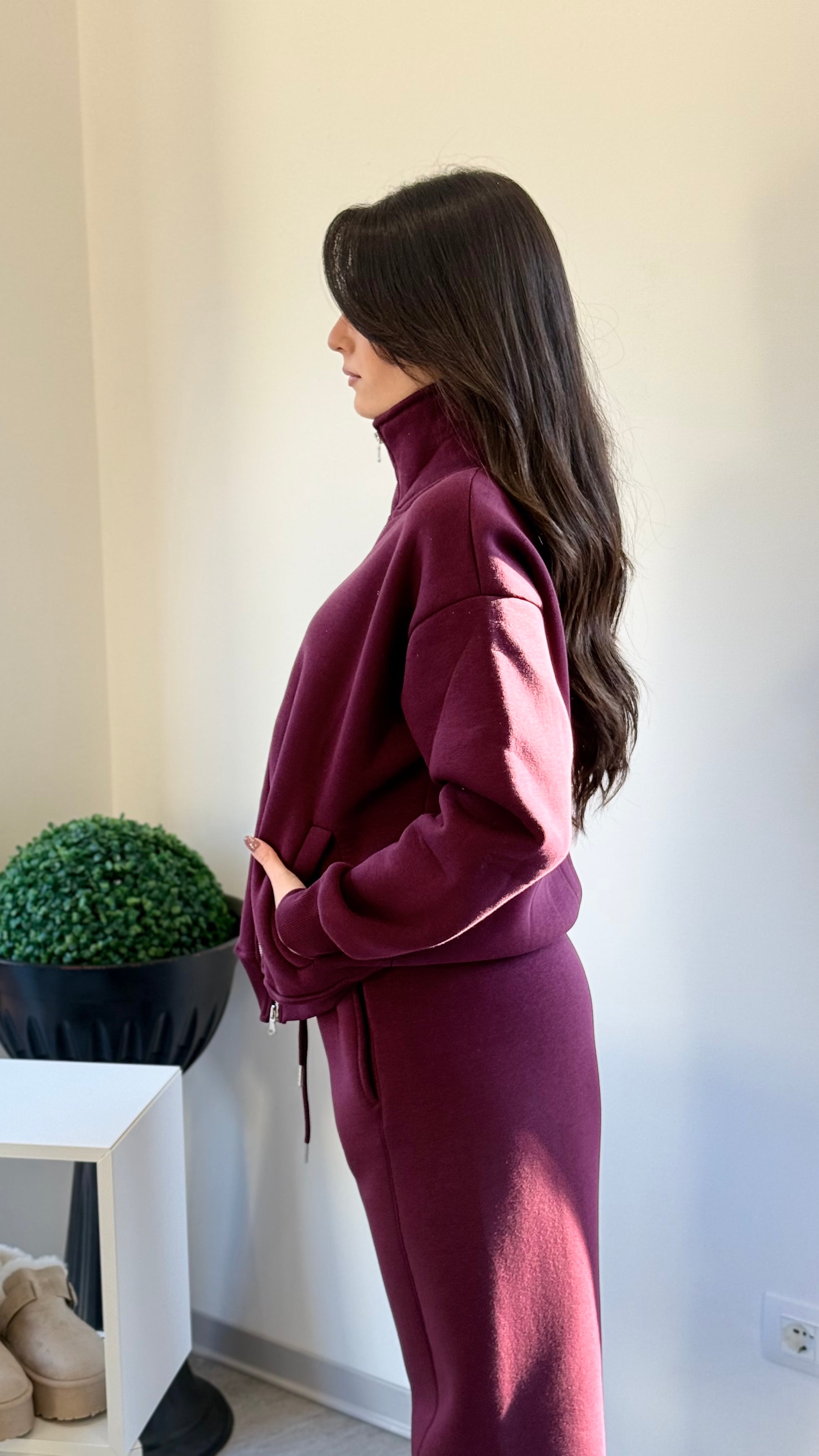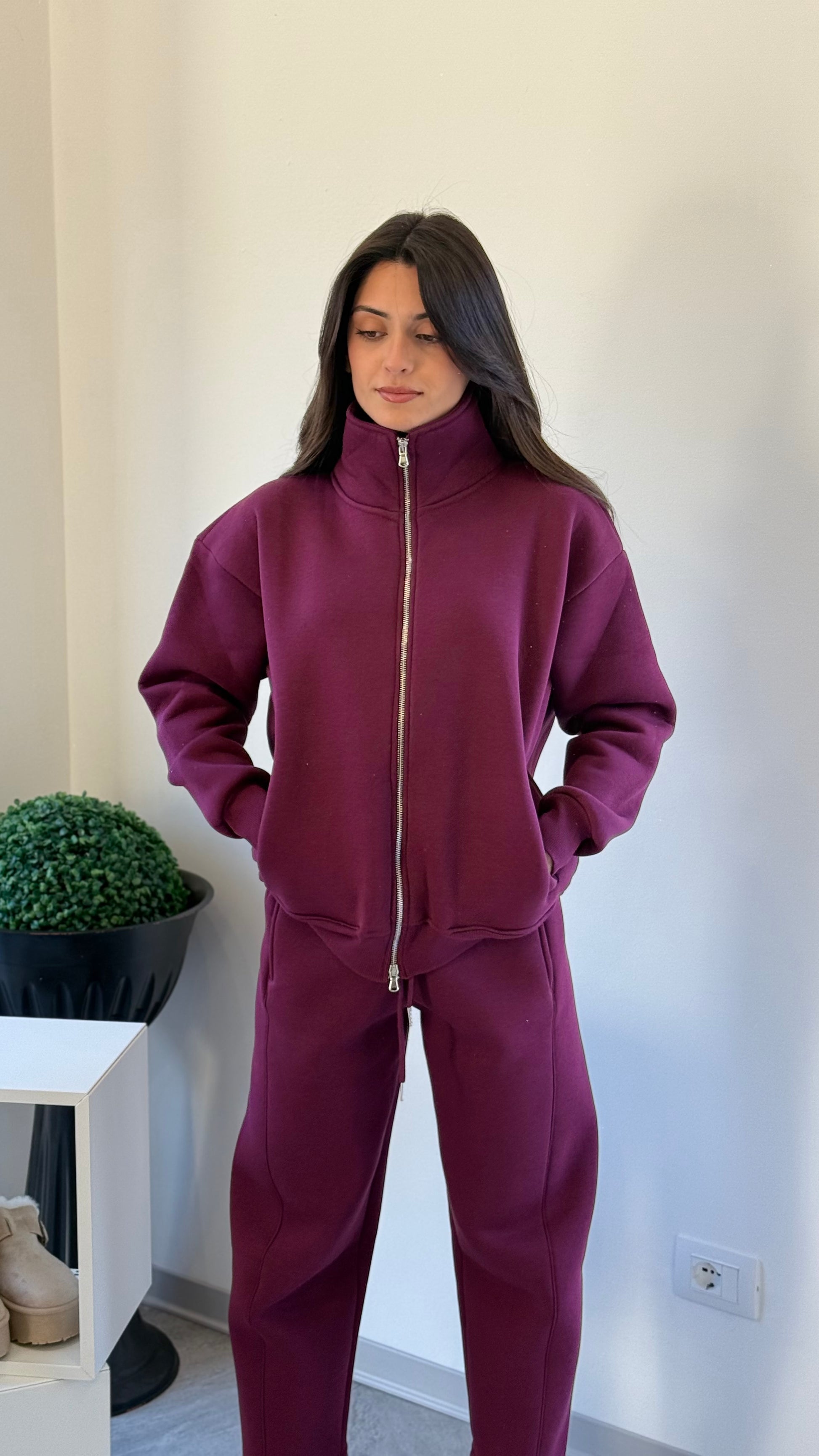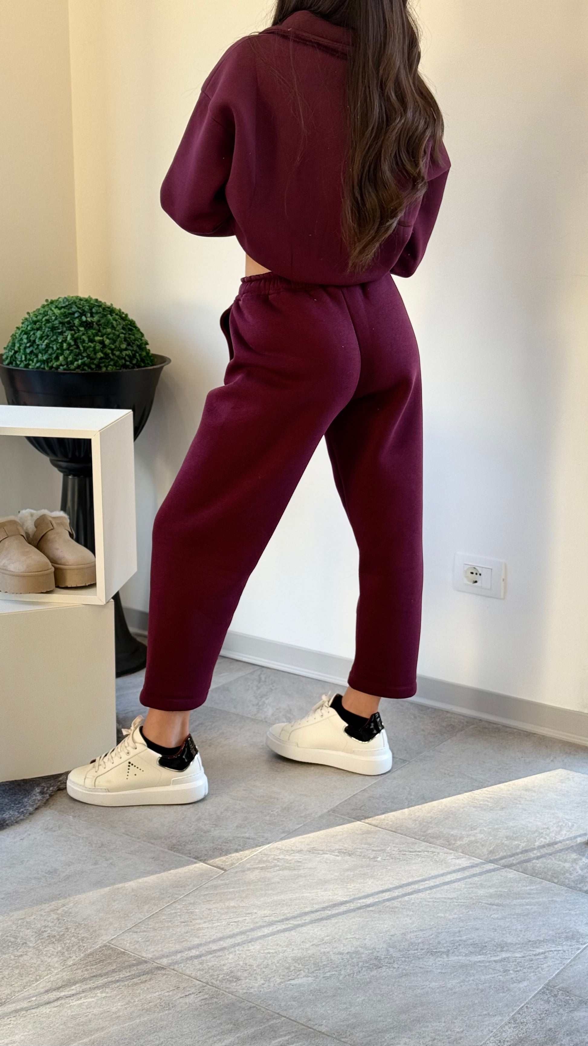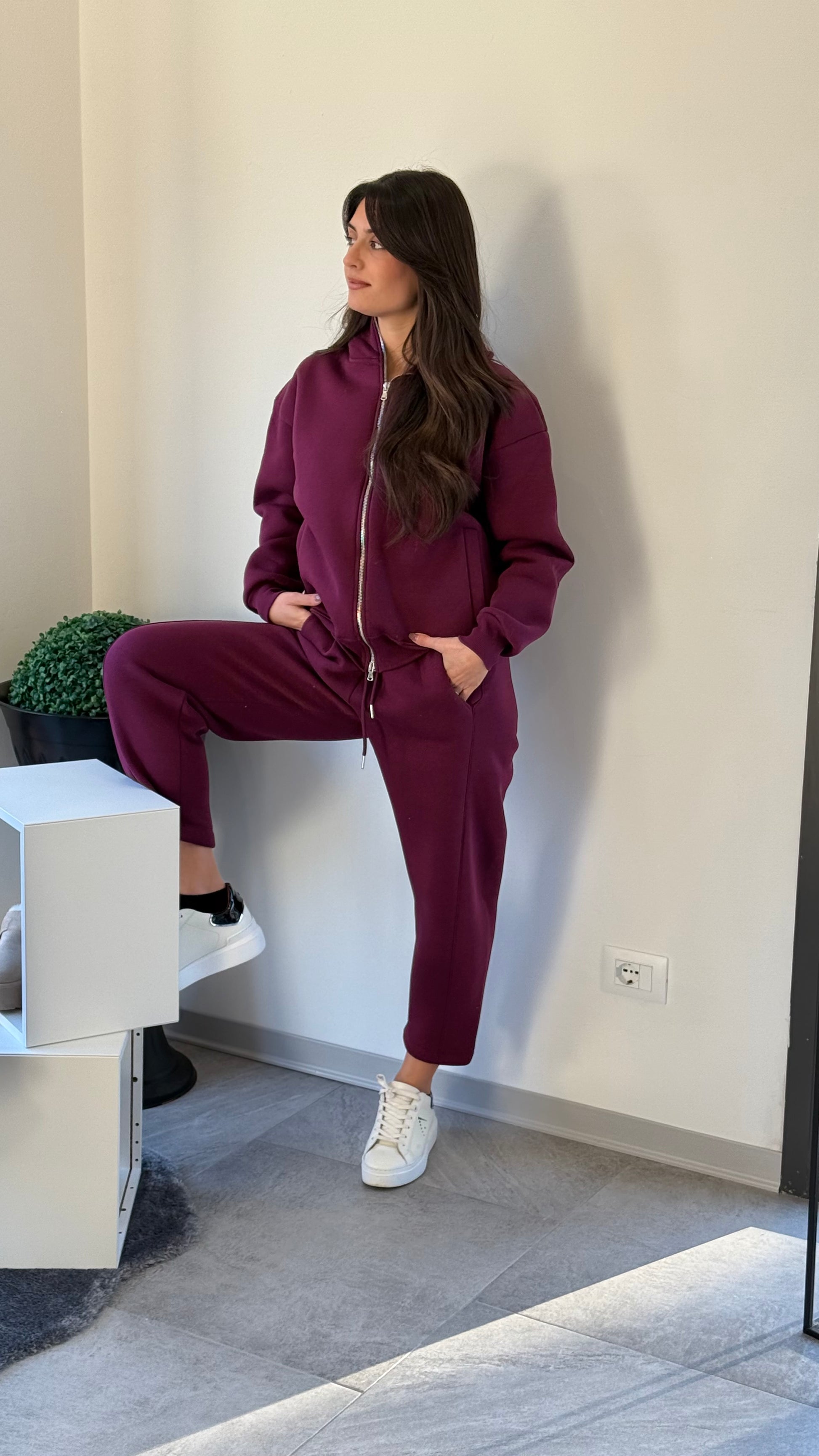 Moderna e confortevole, questa tuta felpata color vino presenta una zip frontale e un collo leggermente alto per un tocco di eleganza. I pantaloni, ampi sulle cosce e affusolati verso la caviglia senza polsino, garantiscono uno stile casual e raffinato, perfetto per ogni momento della giornata.